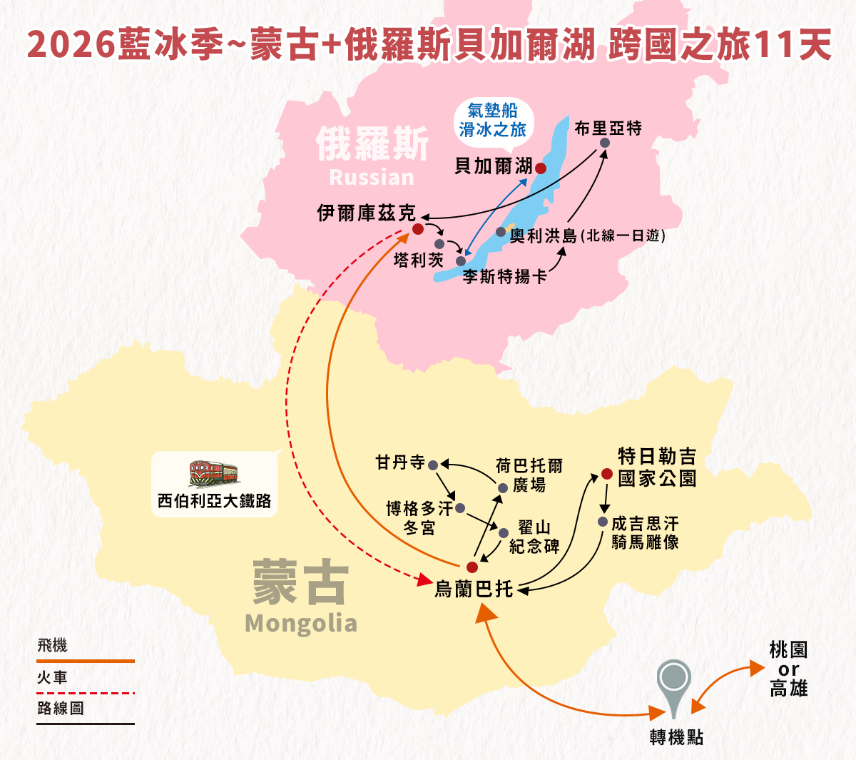 特別安排【鑿冰釣魚】、雪地騎馬體驗。一段中段飛機:烏蘭巴托→伊爾庫茲克。