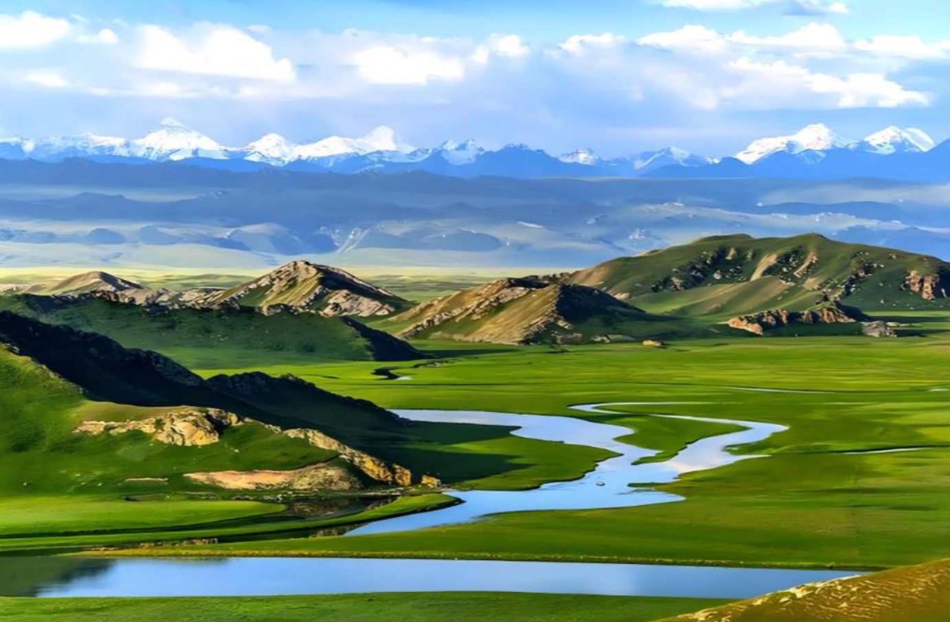 【巴音布魯克大草原】這裡幅員遼闊、水草豐美,一望無際碧綠的草原,令人陶醉。四周爲雪山環抱,是新疆最重要的畜牧業基地之一。《中國國家地理》評爲中國最美六大沼澤濕地之一。