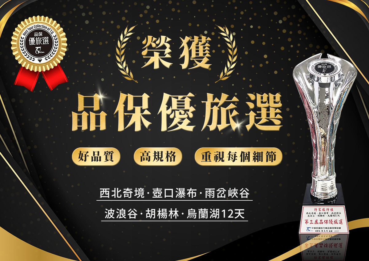 2026/08/11(二) | 桃園國際機場出發 (★優旅獎)西北奇境.壺口瀑布.雨岔峽谷.波浪谷.胡楊林.烏蘭湖12天(自由行)機位 20 候補0 已售0 可售0因禁團令限制此行程及售價僅供參考 |