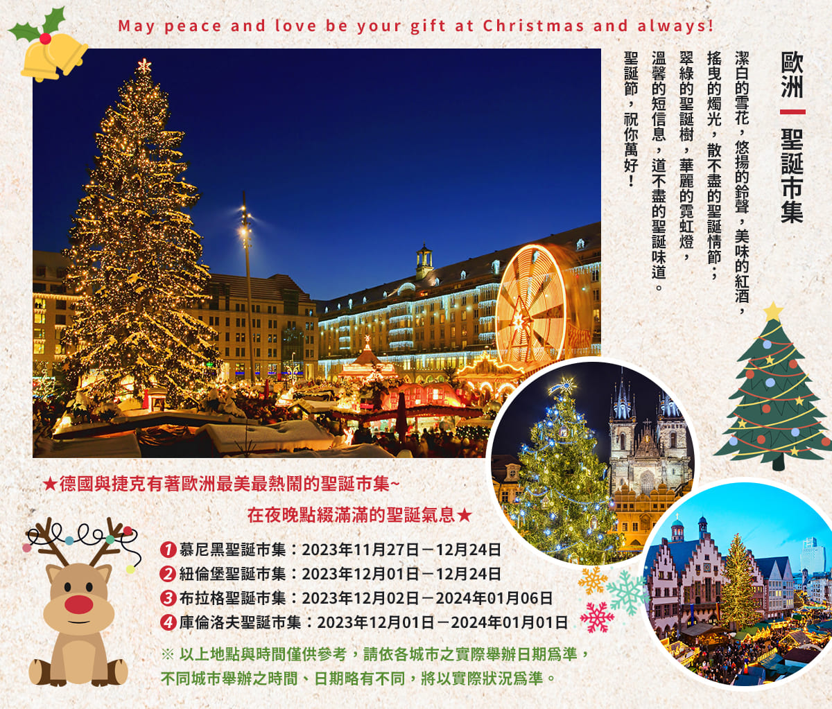 2023聖誕市集~最暖心的冬季旅行‧ 歐洲是冬天裡活潑的孩子,在街道的繽紛燈光中嬉戲 陣陣傳來甜甜的焦糖香氣,教堂旁唱詩班高揚吟唱 人們互相道賀今年的豐收,冬季慶典序幕正悄悄揭開