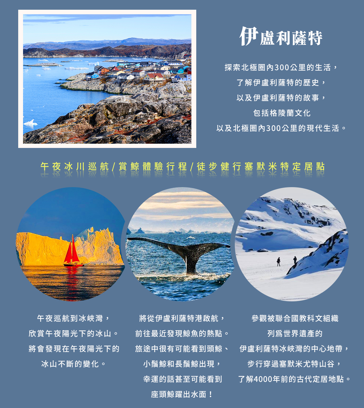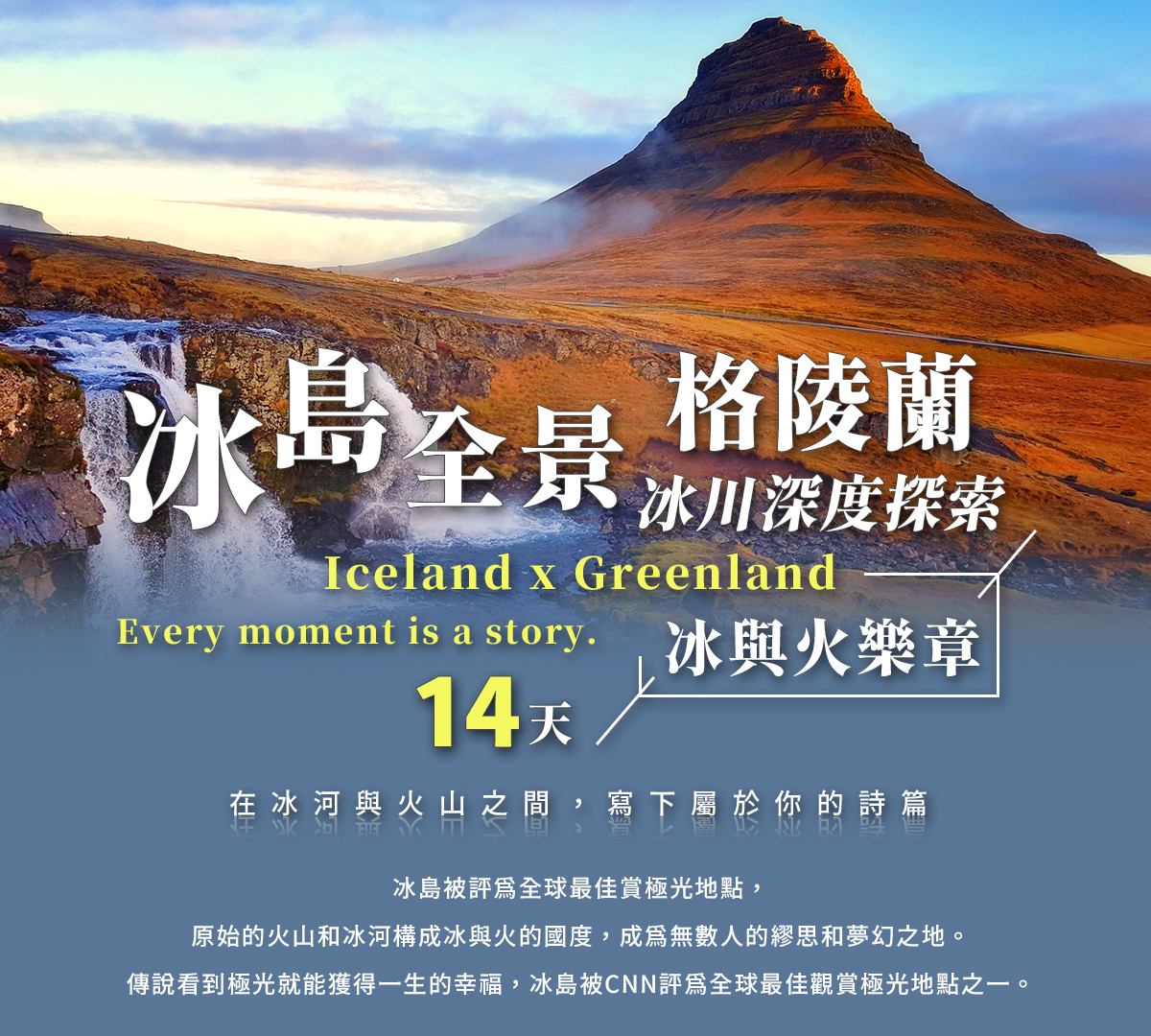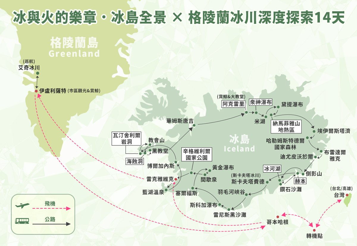 2026/08/14(五) | 台北-桃園機場 出發 冰與火的樂章.冰島全景 × 格陵蘭冰川深度探索14天~藍湖溫泉、賞鯨、艾奇冰川、午夜冰川巡航機位 15 候補0 已售0 可售14早鳥優惠:前10名,第二人減40000 |