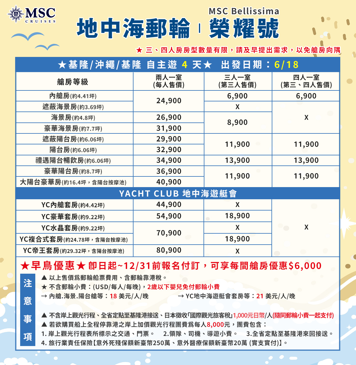 ● 以上售價為郵輪船票費用、含郵輪靠港稅。