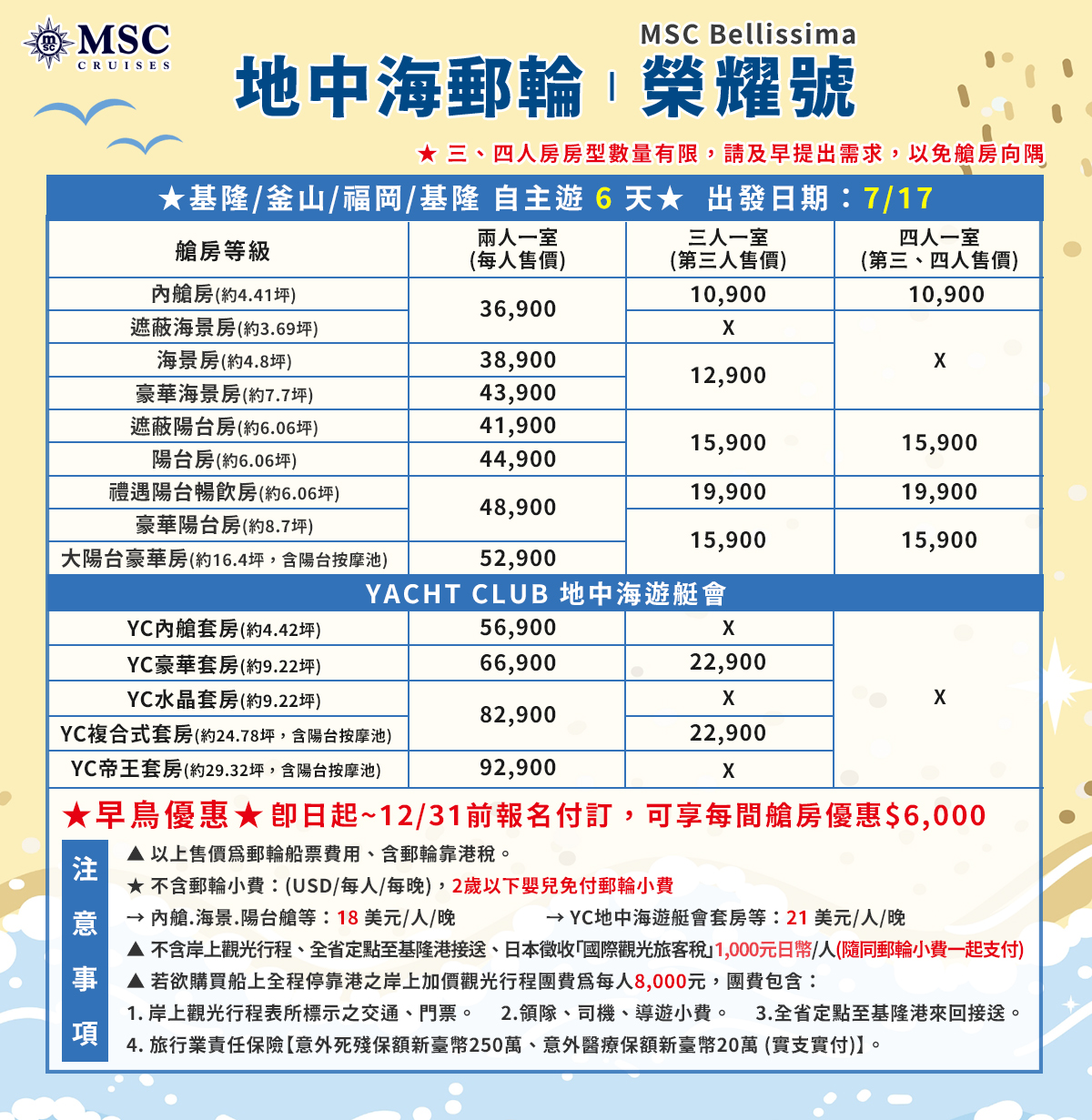 ★【早鳥優惠】於 2025/12/31 前報名並付訂者,可享每間艙房優惠6,000元。