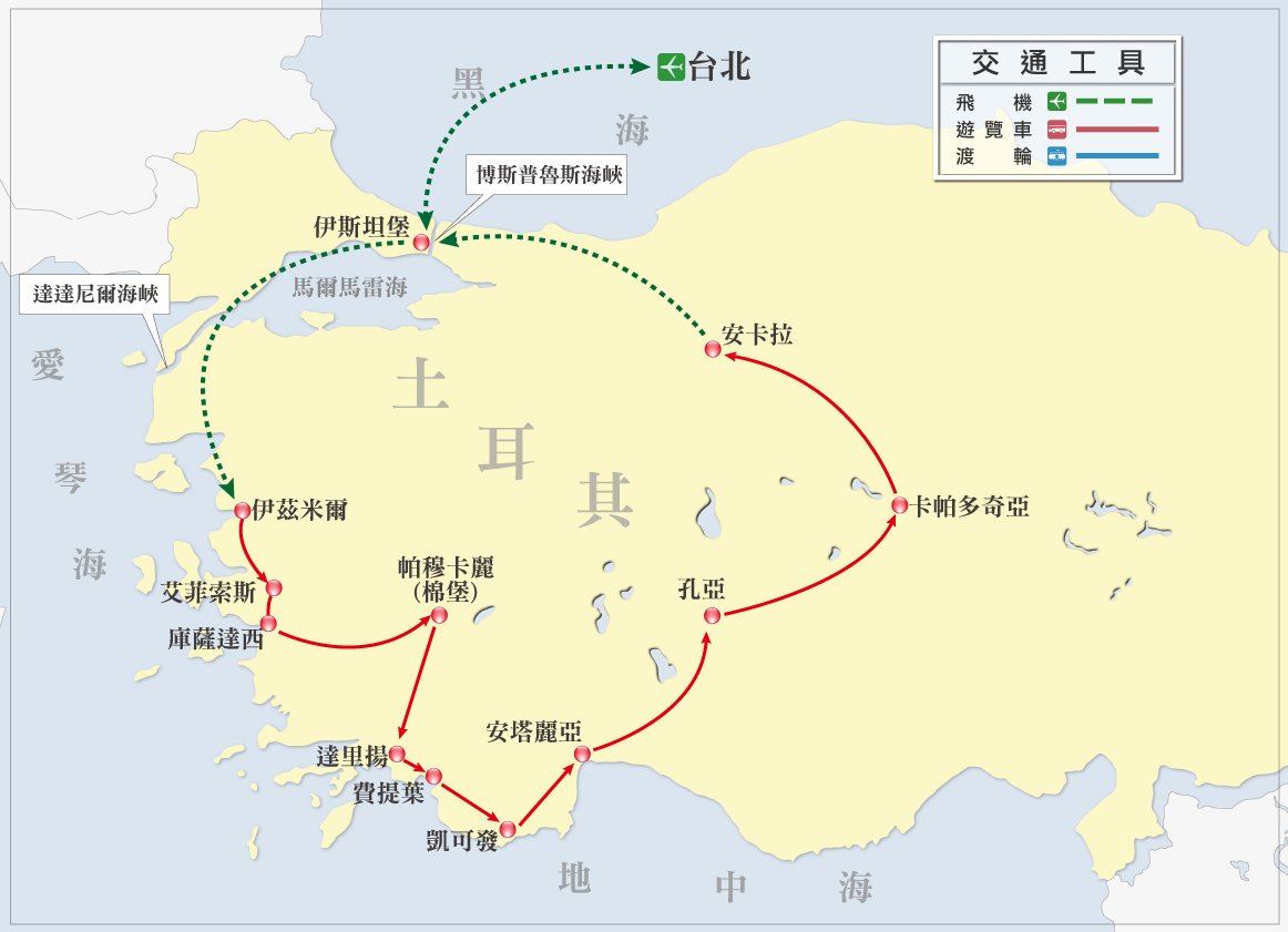 旅途中共安排搭乘2段國內段班機(伊斯坦堡/伊茲米爾, 安卡拉/伊斯坦堡),切實減少行車時間,讓您把最寶貴的時間,在最精華的景點作最深度的遊覽。