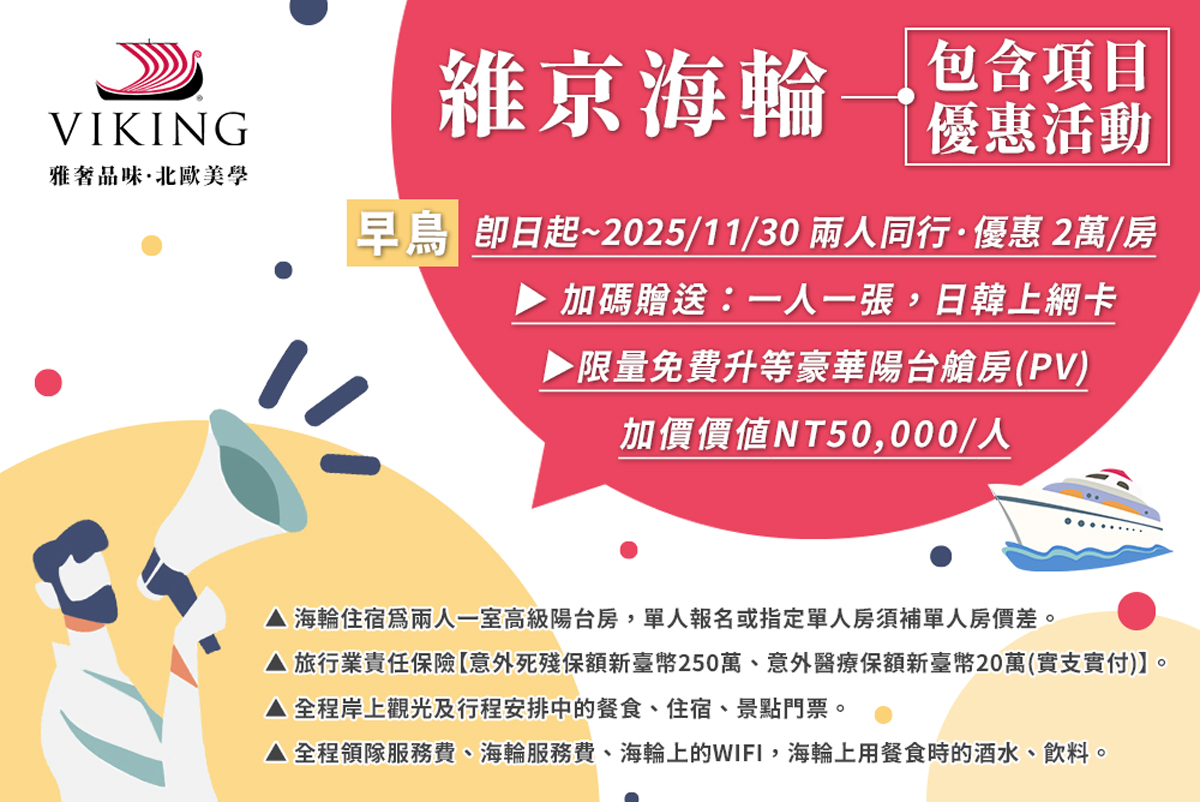 # 維京遊輪保留隨時終止免費升等至豪華陽台艙房(PV)優惠方案之權利。是否享有此優惠,以完成報名並繳交訂金為準。
