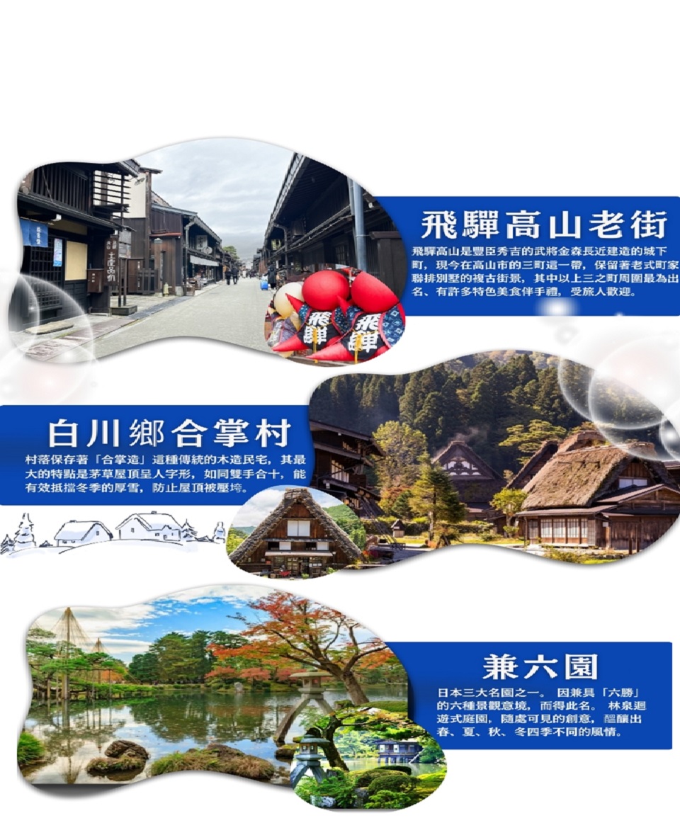 金澤兼六園.白川鄉合掌村.高山古街.國寶犬山城.長島OUTLET