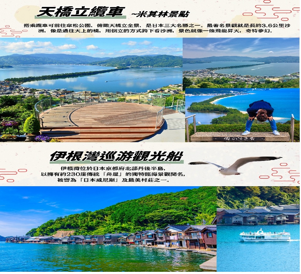 環球影城、神戶須磨海洋世界、天橋立纜車、伊根灣遊船、有馬溫泉、近江八幡遊船、平等院