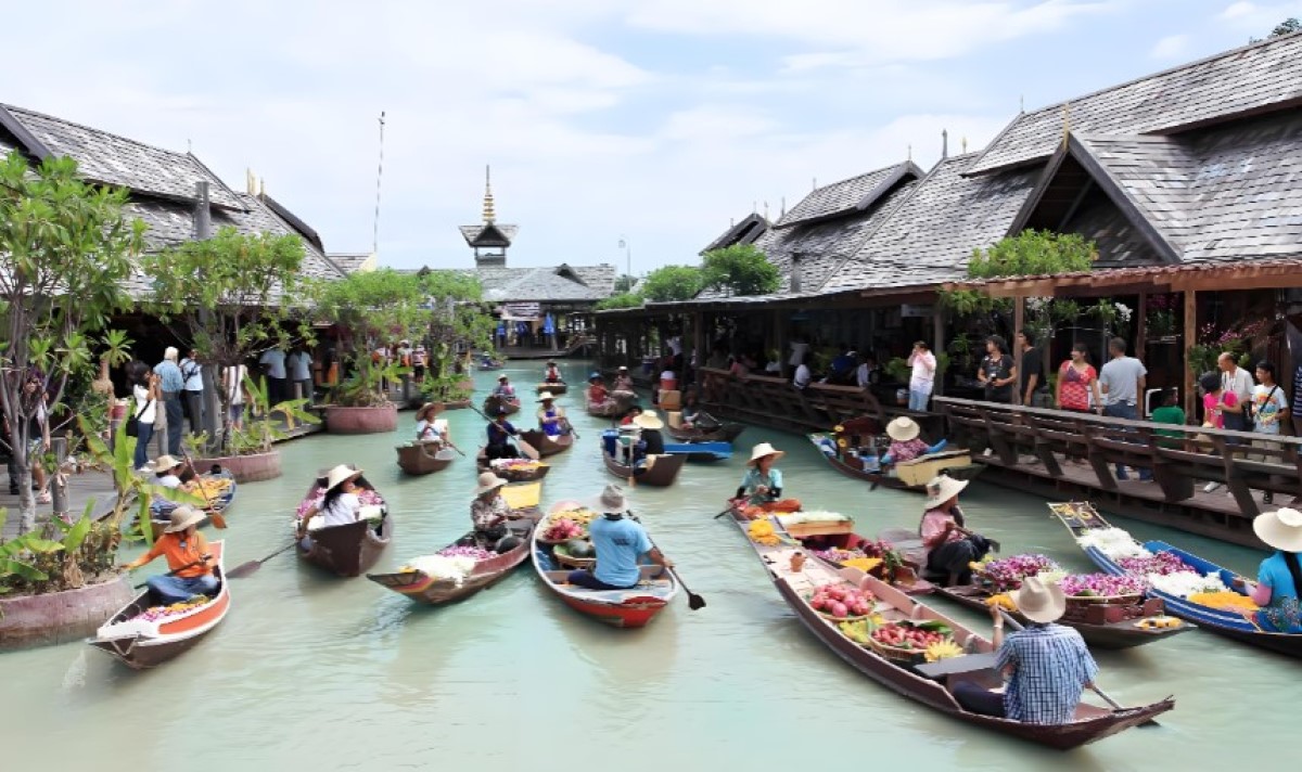 【四方水上市場】匯集泰國東、西、南、北部特色。遊客可搭乘手搖船穿梭於木造建築間,盡情品嚐道地小吃、欣賞傳統表演,並選購精緻手工藝品,是體驗泰國水上文化的經典景點。
