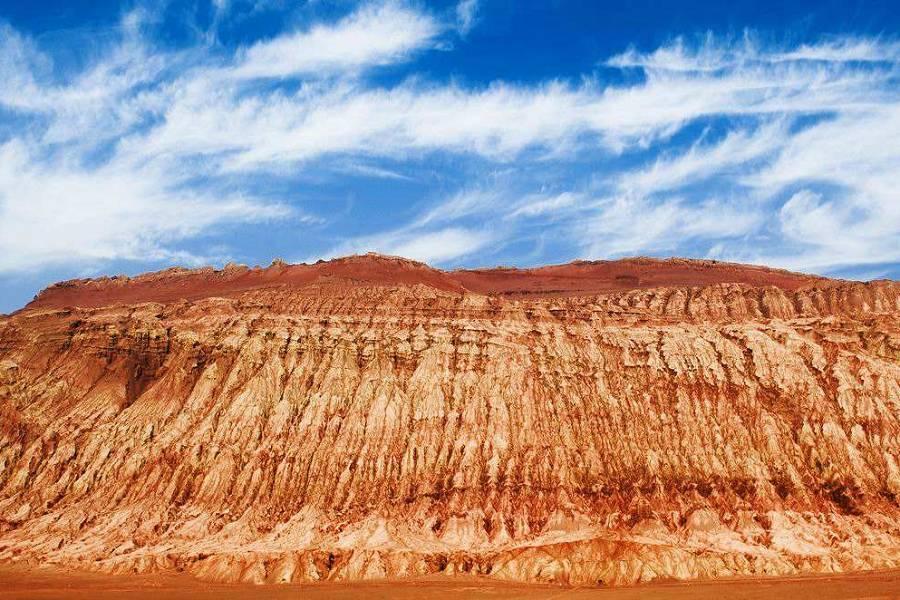 【火焰山】(遊覽時間約 1 小時),火焰山的炎熱乾燥,皆歸因於此地獨特的自然地理條件。火焰山為天山支脈之一,形成於五、六千萬年前的喜馬拉雅造山運動時期。千萬年間,地殼橫向運動時留下的無數條褶皺帶和大自然的風蝕雨剝,形成了火焰山起伏的山勢和縱橫的溝壑。火焰山是中國最熱的地方,夏季溫度最高可以達到47.8℃,火焰山山體陽面地表最高溫度可達82.3℃。