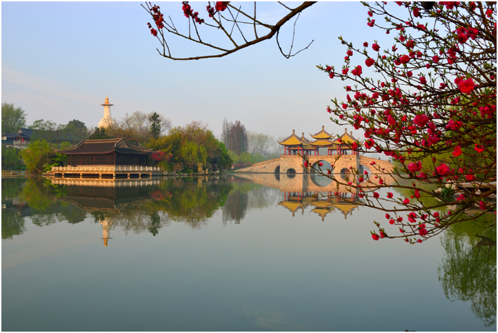 【瘦西湖】 瘦西湖是揚州市內一段狹長的河流,蜿蜒曲折,兩岸綠意盎然,瘦西湖是著名的湖上園林,自然景觀旖旎多姿,這裡的春季綠柳成蔭,加之山茶、石榴、杜鵑、碧桃等花樹相伴,每年吸引著各地遊客來踏青賞花。千百年來,無數文人墨客在此流連忘返,吟詩作畫,留下了眾多墨寶和故事,而且還因地制宜地建造了很多風景建築。