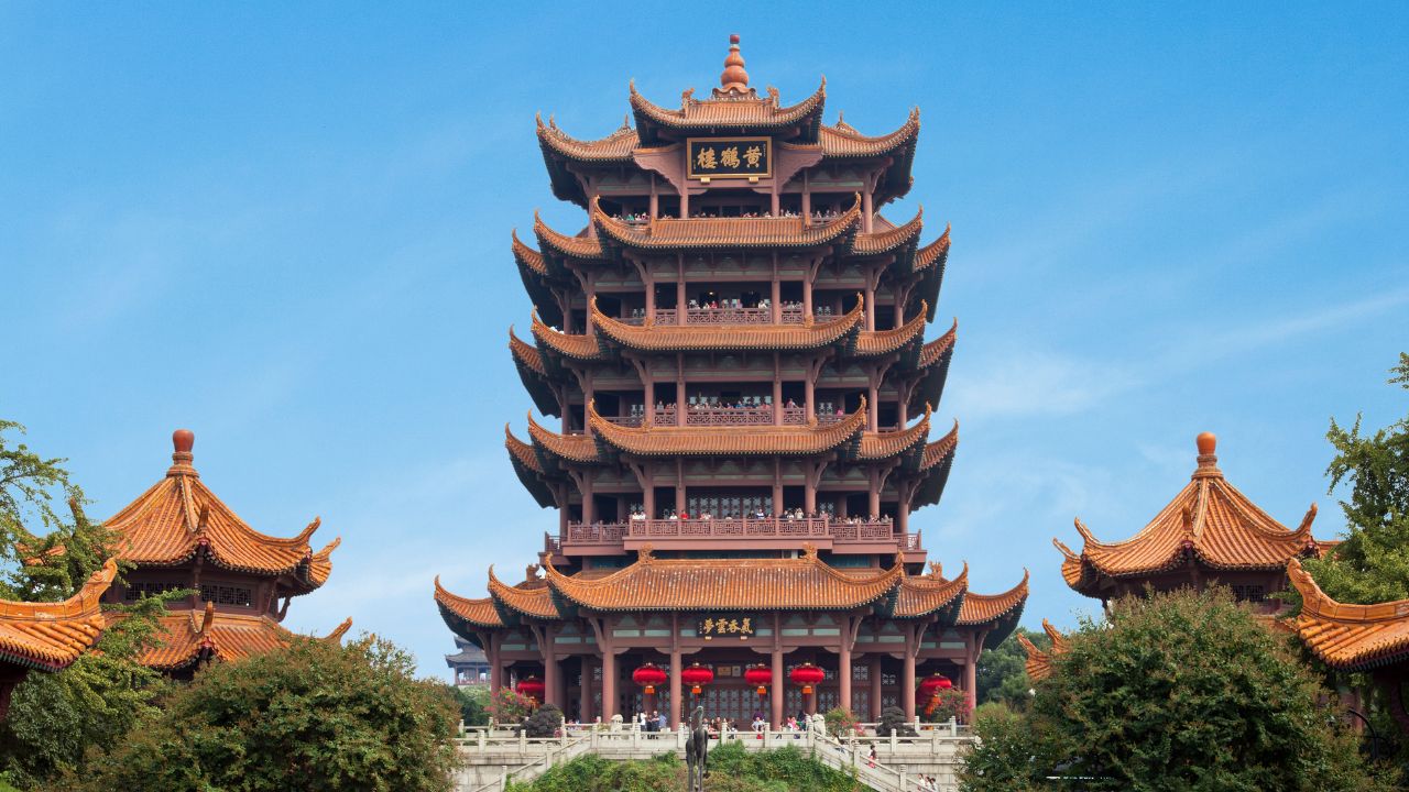 黃鶴樓與嶽陽樓、滕王閣並稱為"江南三大名樓",因唐代詩人崔顥“昔人已乘黃鶴去,此地空餘黃鶴樓”的詩句而名揚天下,此外李白、毛澤東主席等都為黃鶴樓留下了詩詞。相傳原址始建於三國時期,歷代屢建屢毀,今天看到的黃鶴樓,是1985年重建的。黃鶴樓座落在蛇山山頂,樓5層,高50餘米,72根圓柱拔地而起,60個翹角淩空舒展,恰似黃鶴騰飛。樓內各層佈置有大型壁畫、文物等。樓外鑄銅黃鶴造型、勝像寶塔、牌坊、亭閣等一批輔助建築。樓面用10多萬塊黃色琉璃瓦覆蓋,在藍天白雲的映襯下,色彩絢麗。登上黃鶴樓遠眺,可以看到遠處的滾滾長江和武漢三鎮風光。