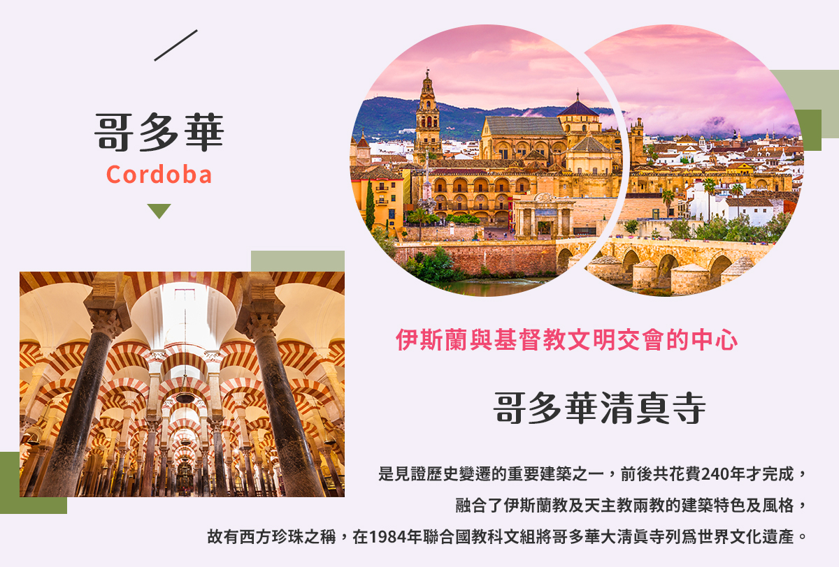 ◎哥多華清真寺 是見證歷史變遷的重要建築之一,前後共花費240年才完成,融合了伊斯蘭教及天主教兩教的建築特色及風格,故有西方珍珠之稱,在1984年聯合國教科文組將哥多華大清真寺列為世界文化遺產。