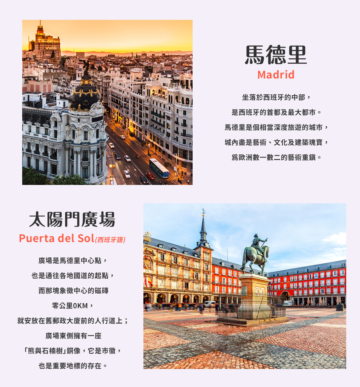 ●太陽門廣場 全城的中心,也是通往各地國道的起點,崁有標示0KM的里程碑,廣場北側有馬德里的市徽熊抱樹雕像,吸引許多遊客合影留念。