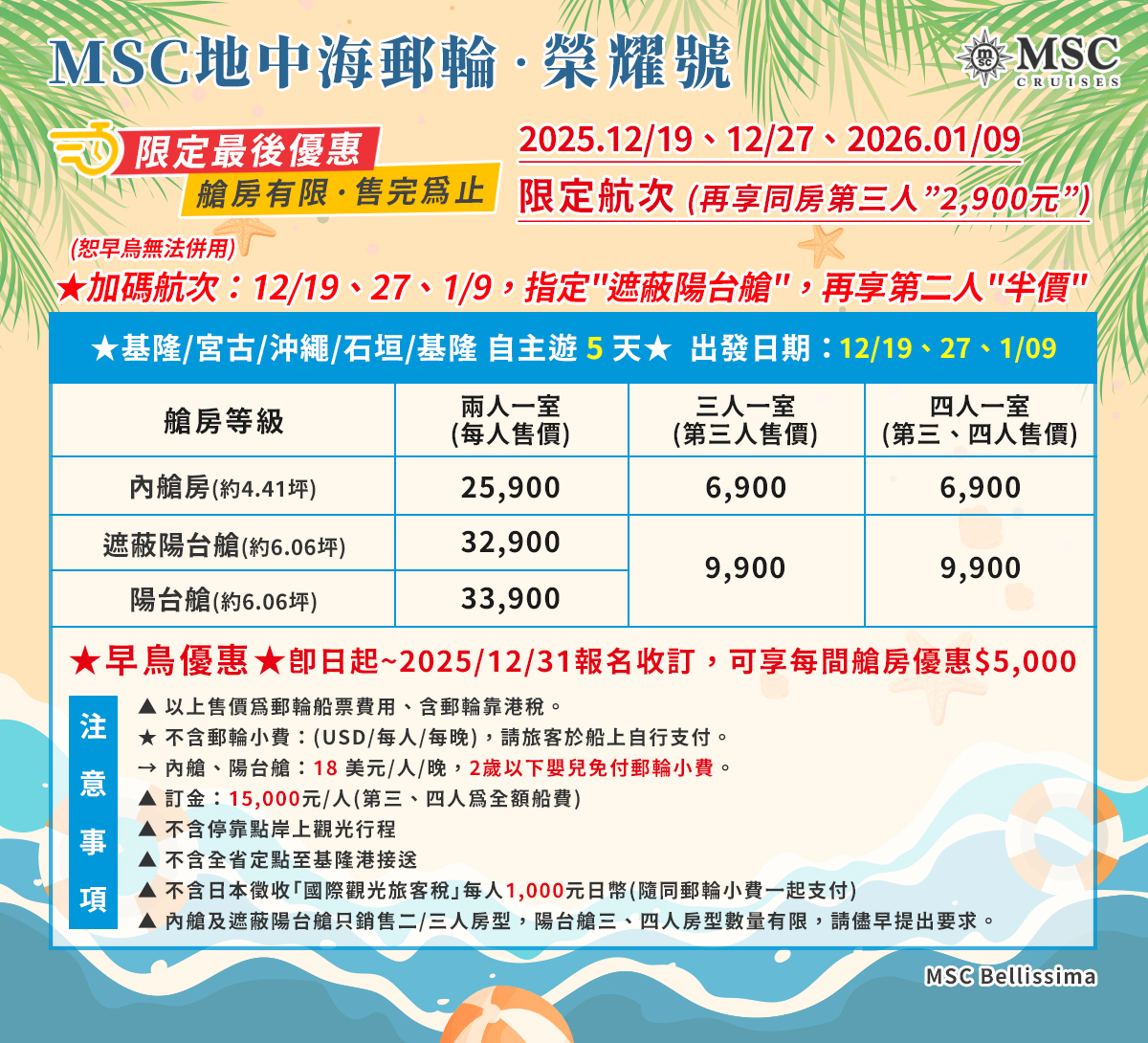 ●早鳥優惠:於12/31前報名並繳付訂金,可享每間艙房減5,000元優惠。