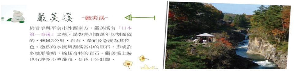 【嚴美溪】遊覽,嚴美溪位於岩手縣平泉市外西南方。嚴美溪有『日本第一美溪』之稱,是磐井川數萬年切割而成的,蜿蜒2公里,岩石、瀑布及急流為其特色。激烈的水流切割溪谷中的巨石,形成許多地形險峭、線條奇特的岩石。嚴美溪上游也有許多小型瀑布,景色十分壯觀,當地名產-『AKKODANGO』,用竹籃及纜繩隔岸傳遞買賣,十分特別。先將錢放入籃子並敲擊板子,籃子就會被拉回對岸的店,再次送回時,籃子已裝有AKKODANGO和茶水,非常特別。