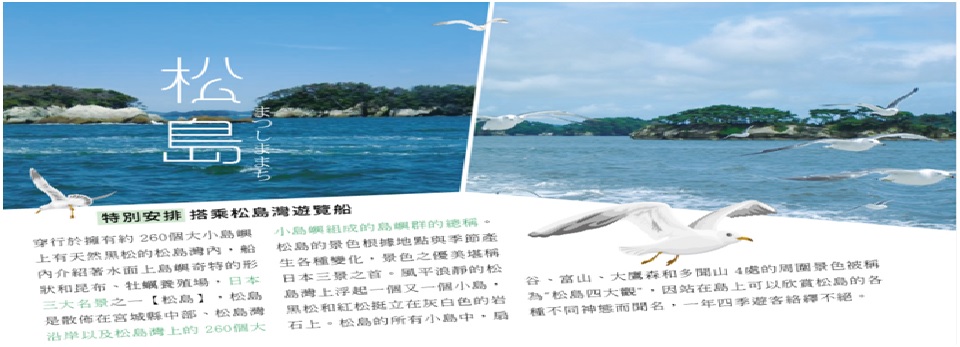 【松島棧橋搭船遊覽松島灣】特別安排搭乘松島灣遊覽船,穿行於擁有約 260個大小島嶼上有天然黑松的松島灣內,船內介紹著水面上島嶼奇特的形狀和昆布、牡蠣養殖場,日本三大名景之一【松島】,松島是散佈在宮城縣中部、松島灣沿岸以及松島灣上的 260個大小島嶼組成的島嶼群的總稱。松島的景色根據地點與季節產生各種變化,景色之優美堪稱日本三景之首。風平浪靜的松島灣上浮起一個又一個小島,黑松和紅松挺立在灰白色的岩石上。松島的所有小島中,扇谷、富山、大鷹森和多聞山 4處的周圍景色被稱為"松島四大觀",因站在島上可以欣賞松島的各種不同神態而聞名,一年四季遊客絡繹不絕。