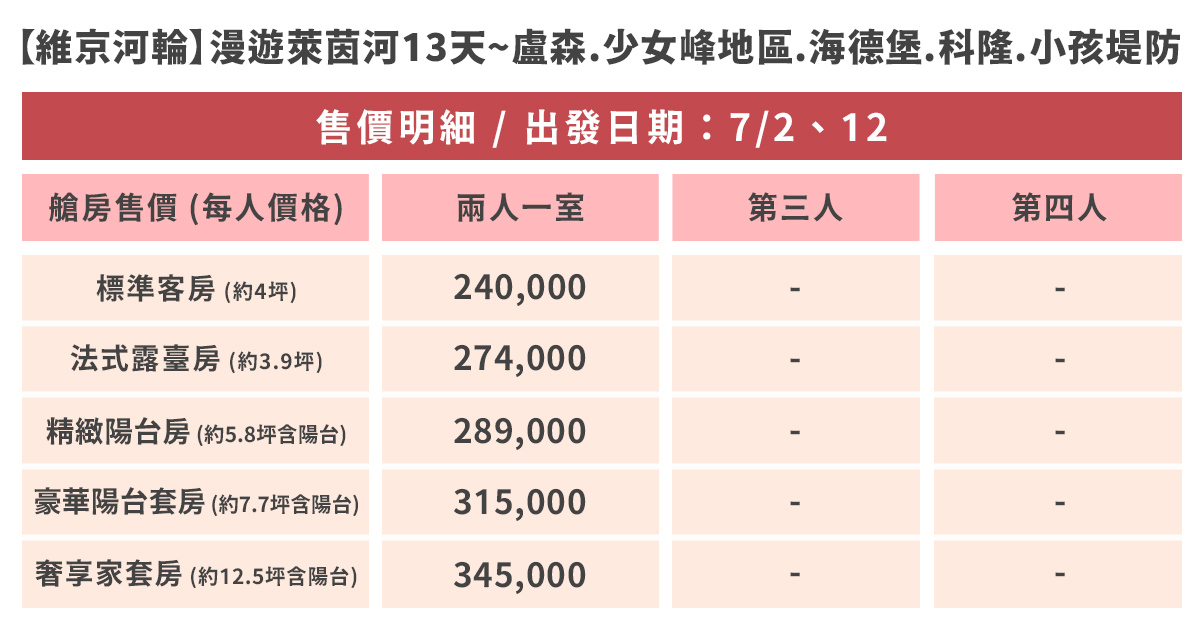 3. 河輪團體船艙大多是Guarantee的保證房,沒有房號可選擇,故無法指定船艙位置,敬請見諒。