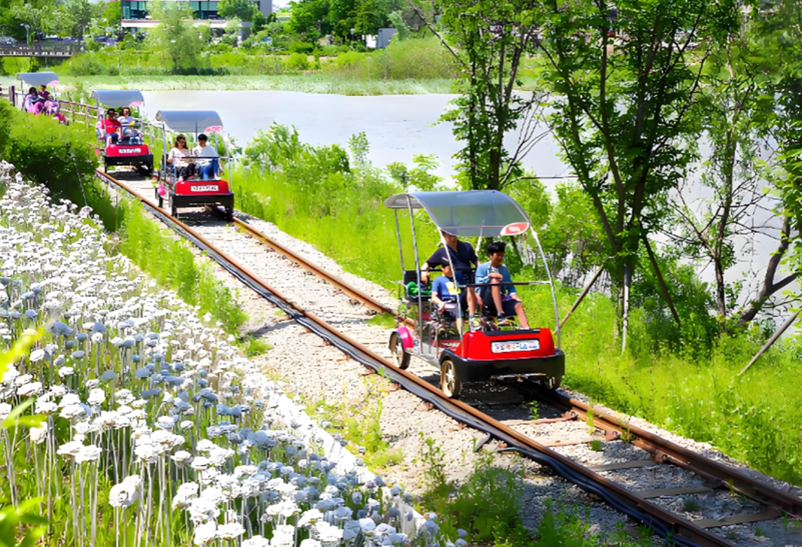 【義王環湖鐵道自行車】位於首爾市南部郊區的京畿道,義王鐵道自行車於2016年4月開始運營,成為韓國首個環湖的鐵道自行車。這條鐵道全長4.3公里,自行車頂設有遮陽板,路線地勢平坦,幾乎沒有上坡或下坡,適合全家一起踏著鐵道自行車,欣賞旺松湖的自然美景。