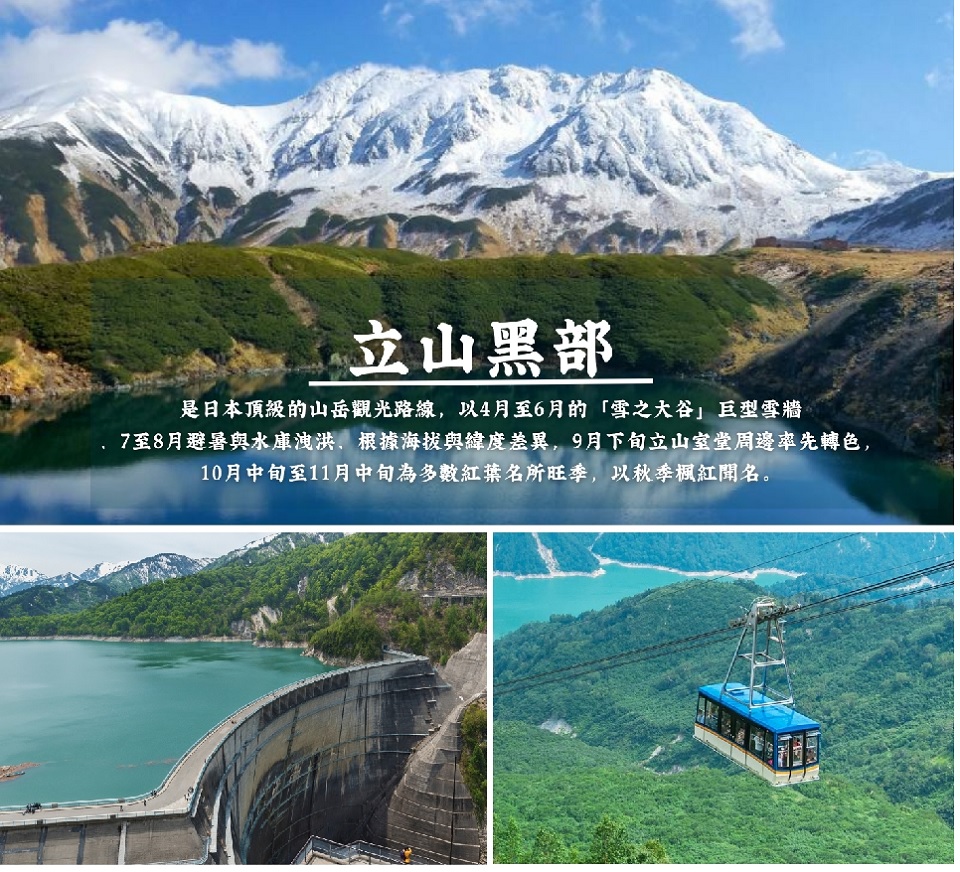 【立山黑部】“高山道路”是從富山地方鐵道的立山車站到長野縣扇澤的全長約86 公里的山嶽道路,可利用巴士、纜車、架空索道等作交通工具。它是爲了建造黑部川第 4 發電所而修建的一條運輸道路,在 1972 年全線開通。立山,在自古以來就就是人們敬奉、修行的名地,這裏有彌漫著硫磺味、寸草不生的地獄谷,還有立山最大的火山湖“禦廚池”,和夏季也不化雪的溪谷。從春天的新綠到秋季的紅葉,一年中前來欣賞四季景觀的登山者絡繹不絕。黑部川上游的黑部水庫,蓄水量 2 億噸,高度爲 186 米,是日本最高的拱形水庫,從水庫展望台看水庫放水,氣勢宏壯,使人百看不厭。高山道路沿途還有許多景點,如一塊巨岩構成的惡城壁以及落差 350 米、氣勢爲日本之最的稱名瀑布和盛夏時期仍湧冒著 2~5度泉水的室堂等,都令遊人讚歎不已。立山黑部峽谷(阿爾卑斯之路):立山的紅葉前線由山頂到美女平,標高差達2000m,紅葉期長達1個月,紅葉帶每天以30m的速度由立山山頂向下降,色層濃淡成三段紅葉,深谷紅葉美不勝收。專車前往「中部山岳國家公國」的入囗玄關:立山車站,轉乘6種登山交通設施,最高點到達海拔2450公尺的室堂,沿途高山四季的綺麗景觀,以及工程建設的鬼斧神工之妙,保證令您嘆為觀止。