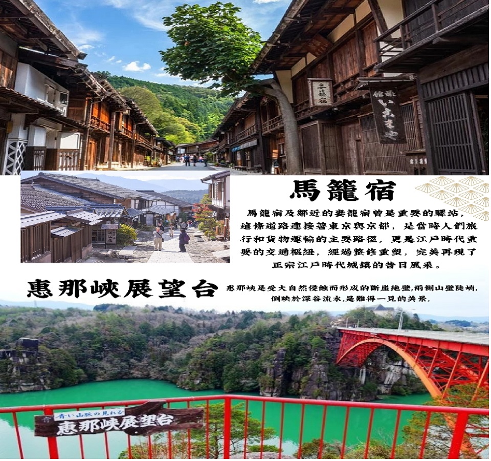 【馬籠宿】此乃當年江戶和京都的中山道,因穿越深山的木曾路而被稱作木曾街道,沿途景象彷彿回到當年的場景,充滿著江戶時期的味道,它是六十九個驛站中的第四十二個,由於街道建築保存良好而成為日本傳統建築群的保留區。