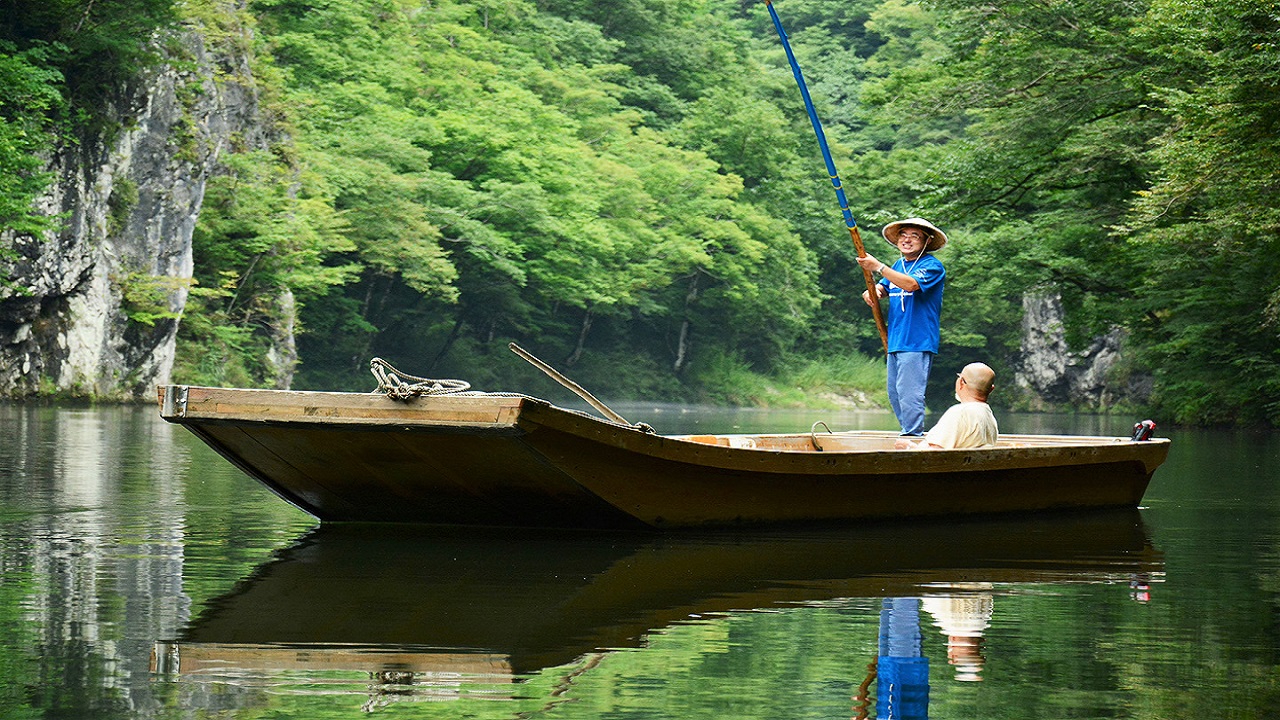 【日本百景~猊鼻溪】搭乘遊船欣賞峽谷之美,「猊鼻溪」的「猊鼻」則是因為開拓者「佐藤猊巌」在溪谷上遊攬勝折返時發現岩壁上有塊突出的大鍾乳石,形狀像是獅子,而獅子在古意中則稱之為「猊」,因此得猊鼻溪之名。一年四季各有不同風景,乘著輕舟小船穿梭在兩岸溪谷,聽著船夫哼著船歌,氣氛相當不錯。