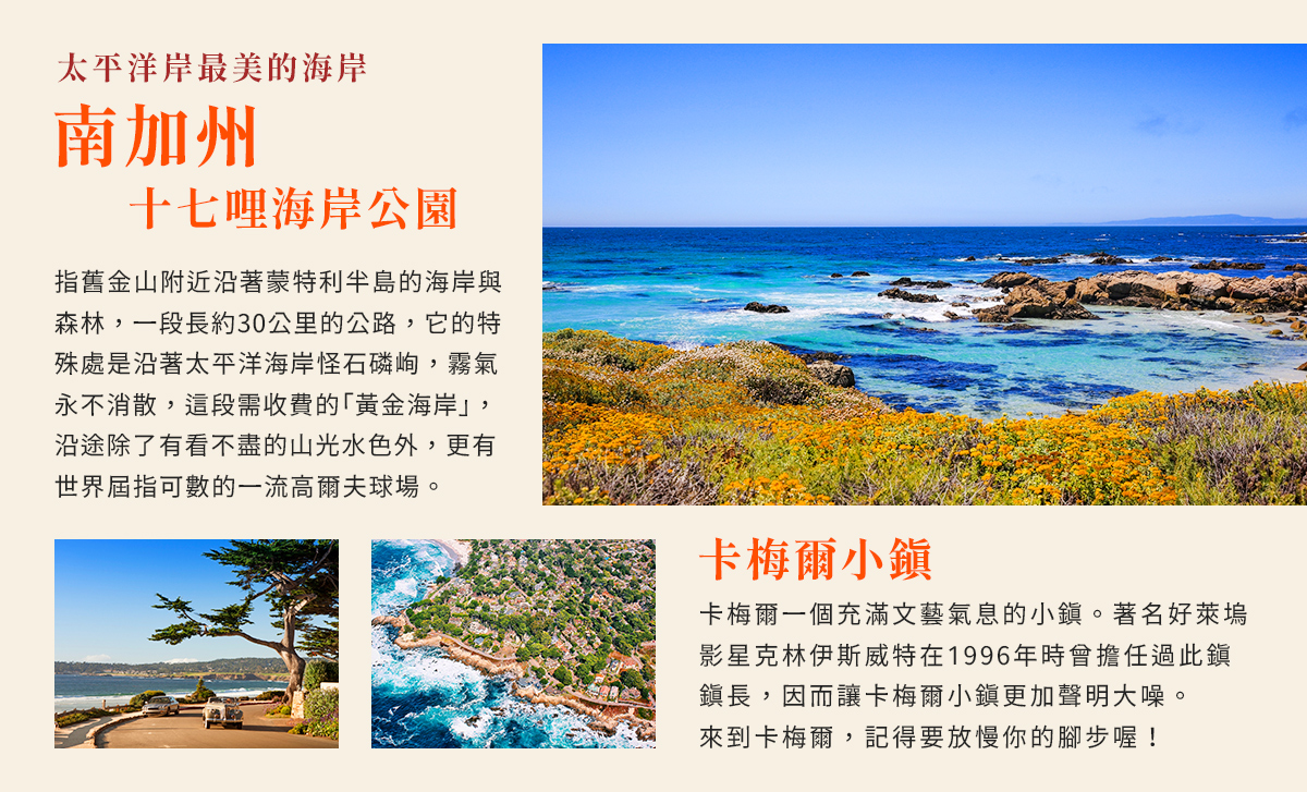 南加州太平洋岸最美的★十七哩黃金海岸景觀大道,它是指舊金山附近沿著蒙特利半島的海岸與森林,一段長約30公里的公路,它的特殊處是沿著太平洋海岸怪石磷峋,霧氣永不消散,這段需收費的「黃金海岸」,沿途除了有看不盡的山光水色外,更有世界屆指可數的一流高爾夫球場,這一段景緻您除了可欣賞杉柏與岩石特殊的景觀,運氣好還可見到各種海岸動物,尤其是小巧可愛的金花鼠,常常可見。