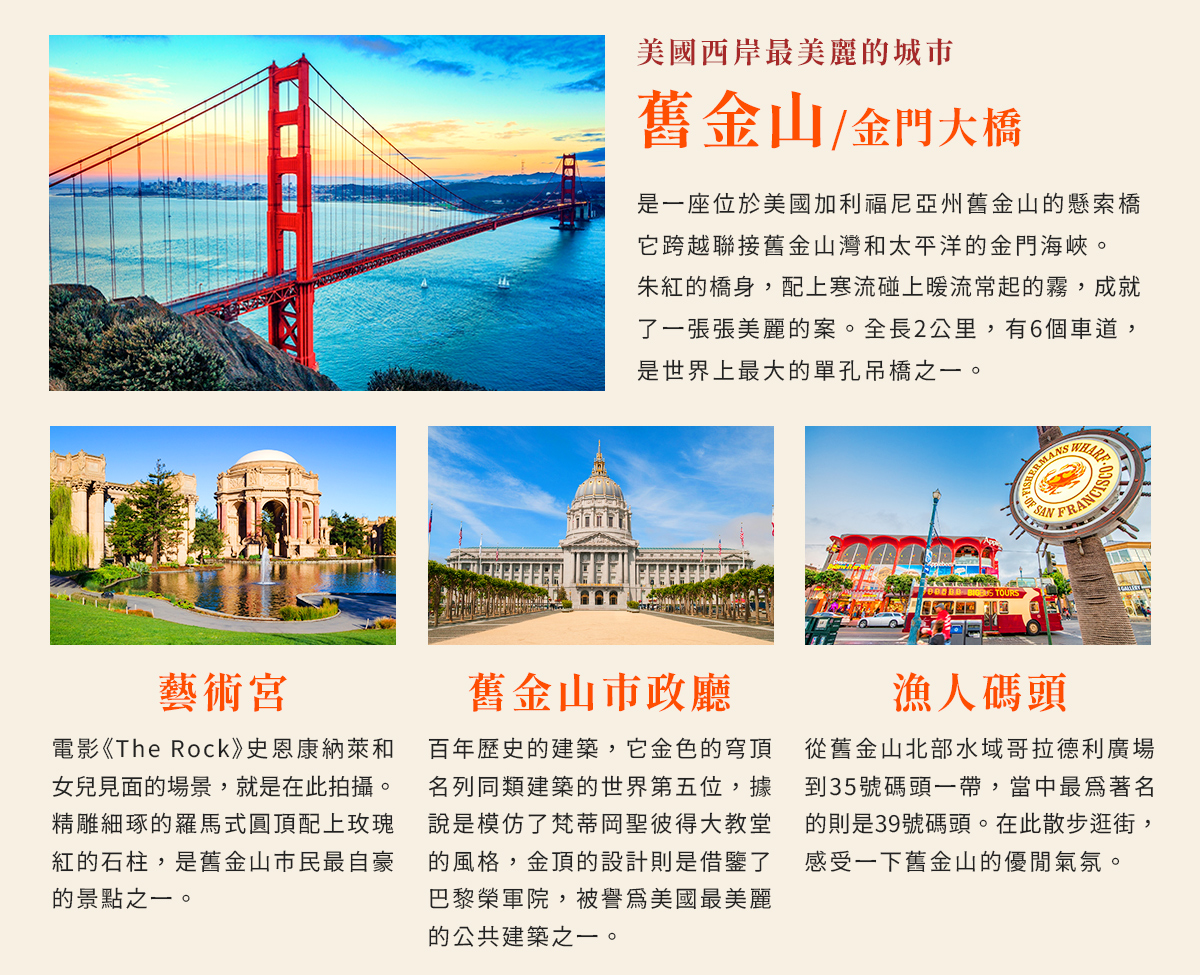 ●漁人碼頭: 舊金山最著名景點不能不提到漁人碼頭,是觀光客不能錯過的熱門打卡點。最熱鬧的區域就屬35號碼頭到39號碼頭一帶,39號碼頭如今已是漁人碼頭的統稱,是舊金山最具代表性的景點之一。來到碼頭邊可以盡情享受海鮮美味、欣賞街頭表演,不僅有大大小小的紀念品商店,更不能錯過看海獅寶寶們曬太陽作日光浴的畫面,模樣十分逗趣。