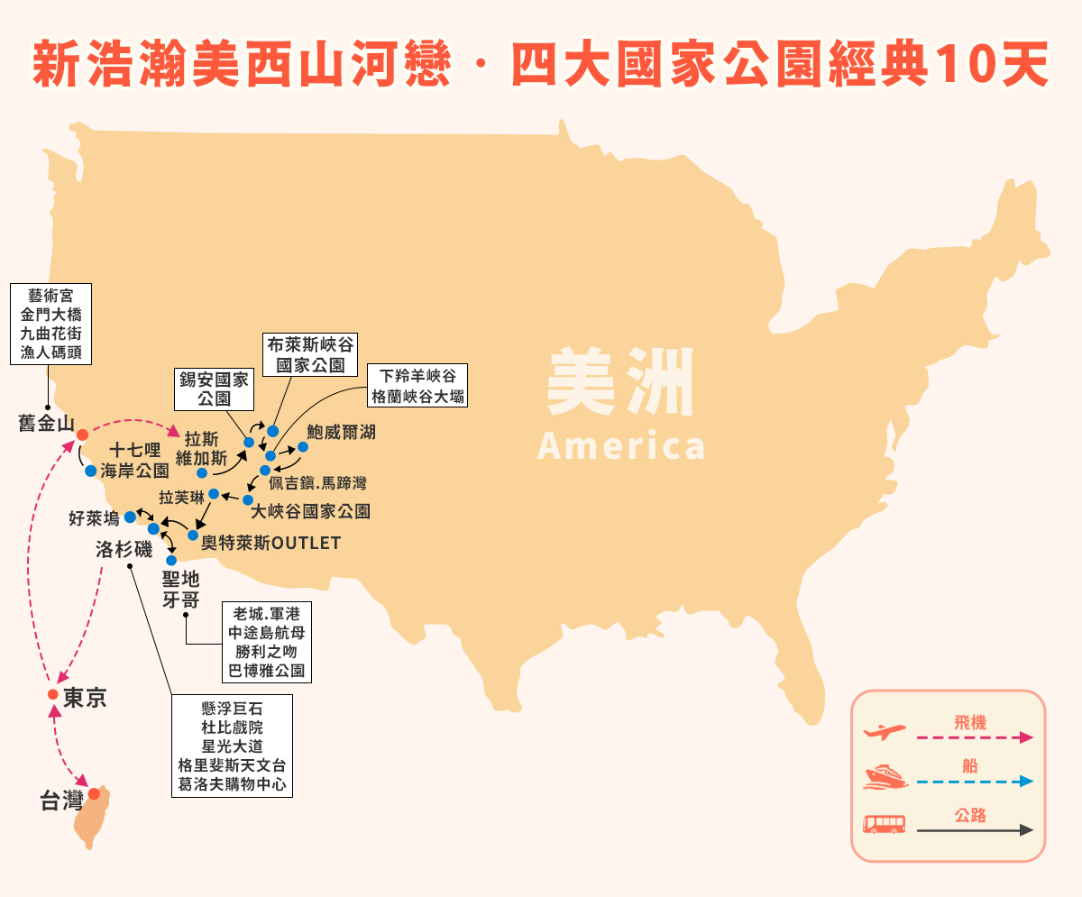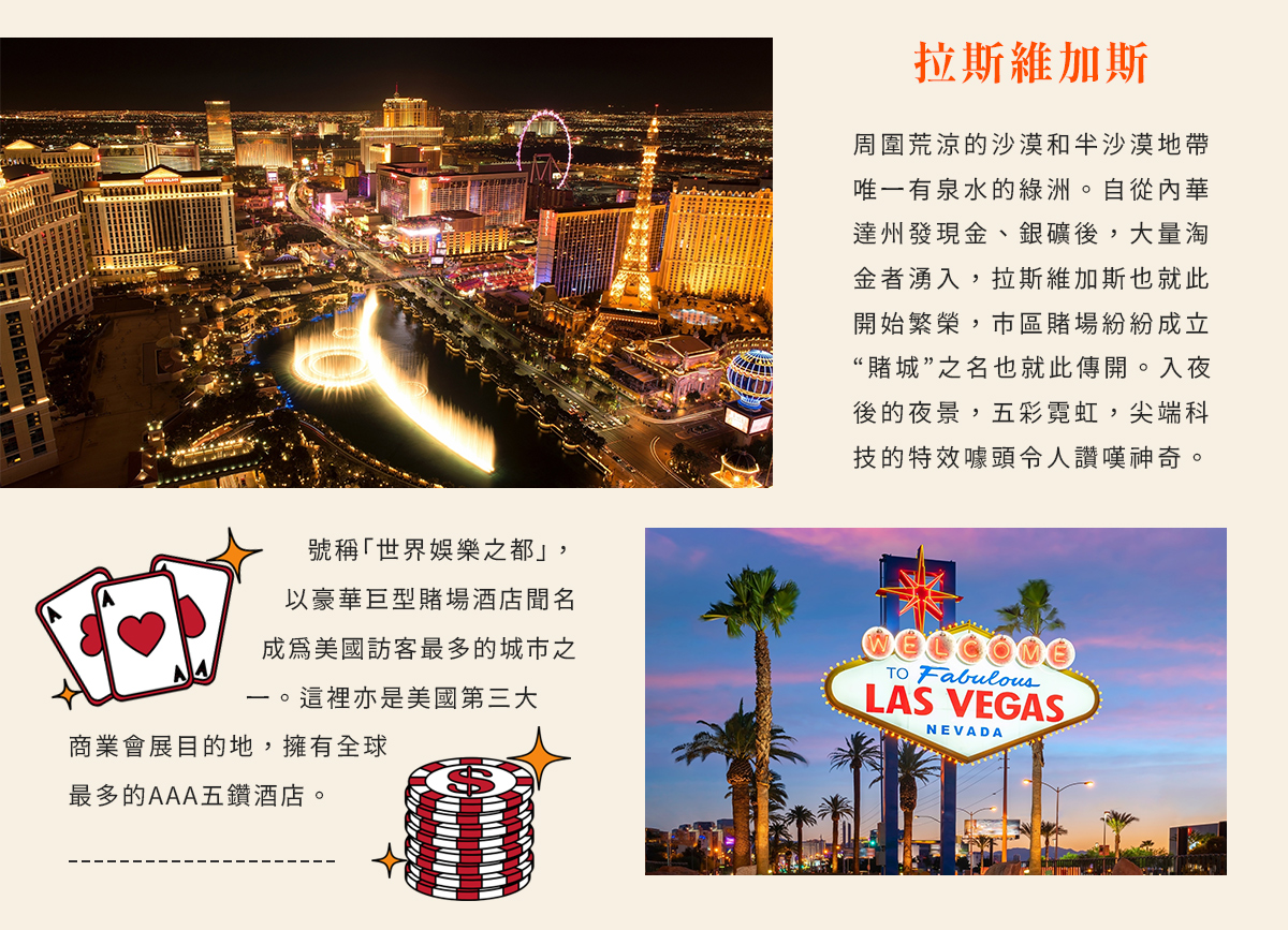 【拉斯維加斯】源自西班牙語,意思為“肥沃的青草地”,因為拉斯維加斯是周圍荒涼的沙漠和半沙漠地帶唯一有泉水的綠洲。自從內華達州發現金、銀礦後,大量淘金者湧入,拉斯維加斯也就此開始繁榮,市區的賭場紛紛成立,“賭城”之名也就此傳開。入夜後的夜景,五彩霓虹,尖端科技的特效噱頭令人讚嘆神奇。您可以自費參加拉斯維加斯夜遊,欣賞拉斯維加斯迷人的夜景,包括球形展場(The Sphere)、Bellagio水舞、舊城的天幕秀...等。(實際內容以現場操作為準)