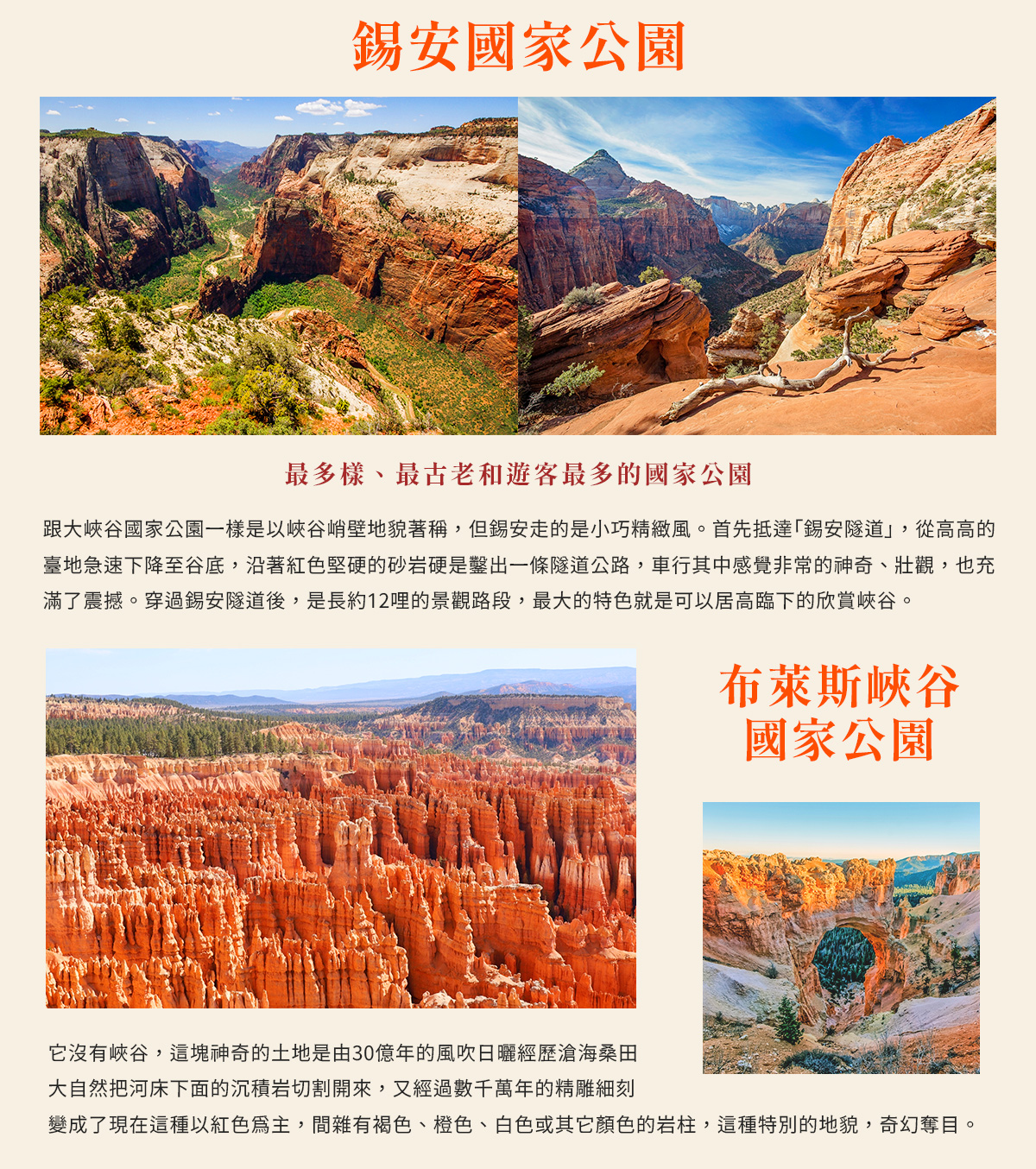 【錫安國家公園】猶他州最多樣、最古老和遊客最多的國家公園,跟大峽谷國家公園一樣是以峽谷峭壁地貌著稱,但錫安走的是小巧精緻風。首先抵達「●錫安隧道」,從高高的臺地急速下降至谷底,沿著紅色堅硬的砂岩硬是鑿出一條隧道公路,車行其中感覺非常的神奇、壯觀,也充滿了震撼。穿過錫安隧道後,是長約12哩的景觀路段,最大的特色就是可以居高臨下的欣賞峽谷。接著來到山壁上有著形似棋盤格狀的「●棋盤山」,故名思義,整座山像一面巨大的棋盤,高達2056公尺的白色山石,上面的線條縱橫交錯,整齊有致,聳立在四周均為褐紅色的山峰巨石之中,顯得格外引人注目。