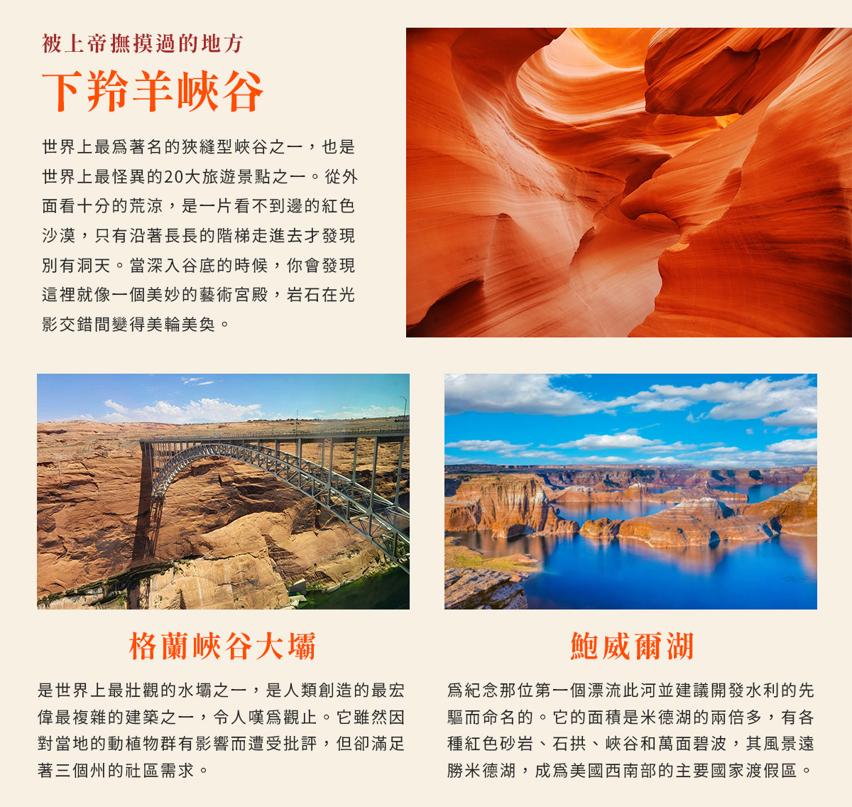 【下羚羊峽谷】世界上最為著名的狹縫型峽谷之一,也是世界上最怪異的20大旅遊景點之一。有人說,羚羊峽谷是「被上帝撫摸過的地方」,因為從外面看十分的荒涼,是一片看不到邊的紅色沙漠,只有沿著長長的階梯走進去才發現別有洞天。當深入谷底的時候,你會發現這裡就像一個美妙的藝術宮殿,岩石在光影交錯間變得美輪美奐,壁谷就像被精心打磨過的一樣,呈現出各種曲線,像火焰在舞蹈;也像漣漪一樣在變化。光線經由不同的角度穿透過特殊的地形,造就出美麗獨特的景象。不論是職業、業餘攝影師或單純喜歡拍照的人都能在此獲得許多的驚喜與樂趣。此行程在集合點集合後,將由專業的嚮導帶您前往下羚羊峽谷,嚮導將為您解說羚羊峽谷的歷史、形成原因以及哪些地方適合拍照。我們將徒步行走於峽谷中,您在這200公尺峽谷中漫步,體驗峽谷之美。