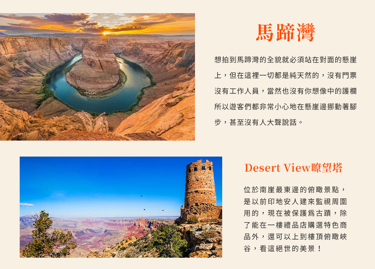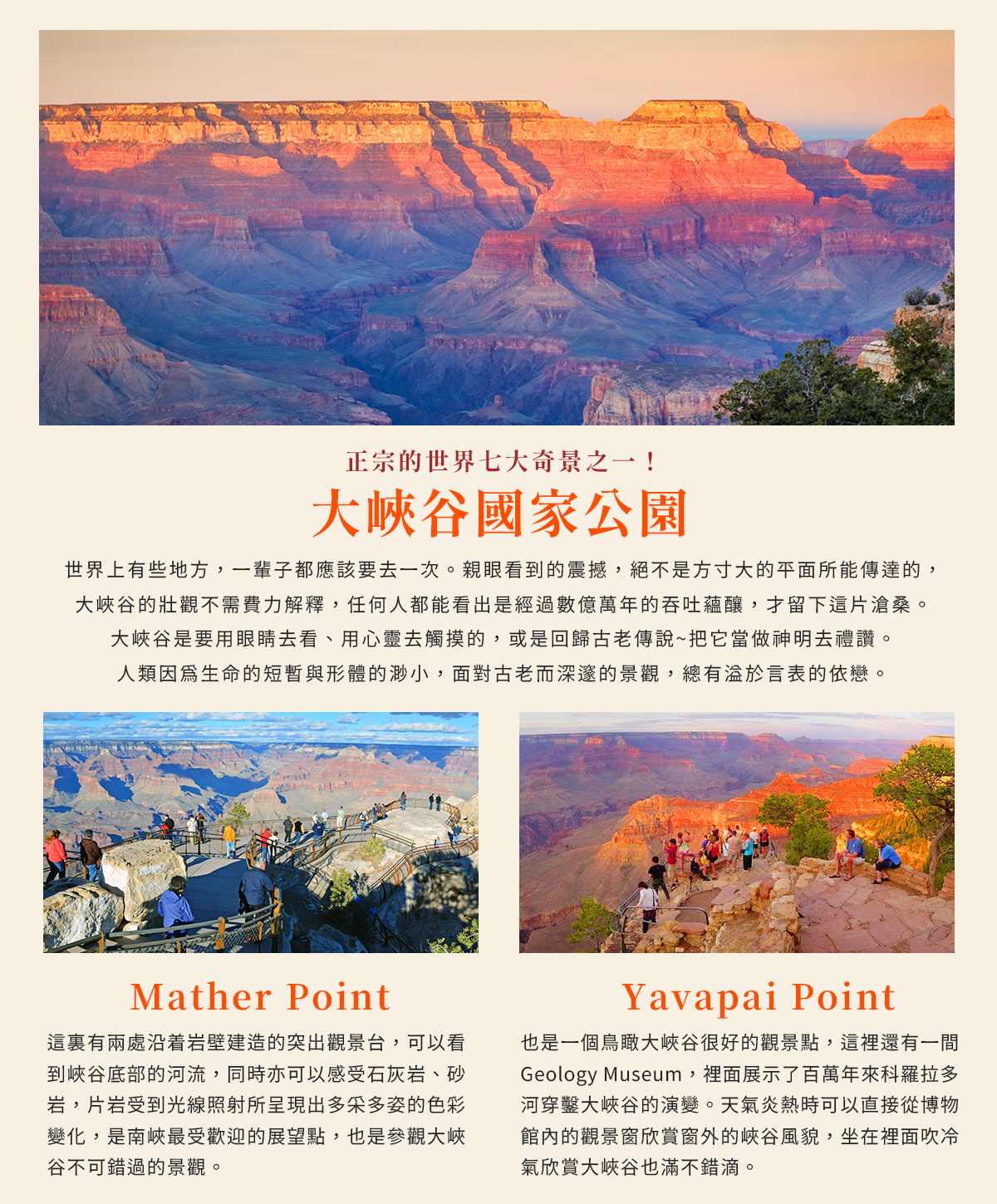 【大峽谷國家公園】正宗的世界七大奇景之一!世界上有些地方,一輩子都應該要去一次。親眼看到的震撼,絕不是方寸大的平面所能傳達的,大峽谷的壯觀不需費力解釋,任何人都能看出是經過數億萬年的吞吐蘊釀,才留下這片滄桑。發掘那被科羅拉多河幾千萬年來切割浸蝕的峽谷遺跡,陽光照射在峽谷岩壁上,而幻化出多彩多姿不同的情景直叫人感覺到人類在宇宙中的渺小,幾十年來有無數的作家想要用筆去將大峽谷的偉大寫出或畫出,但沒有一個人真正的成功,大峽谷是要用眼睛去看、用心靈去觸摸的,或是回歸古老傳說~把它當做神明去禮讚。人類因為生命的短暫與形體的渺小,面對古老而深邃的景觀,總有溢於言表的依戀。