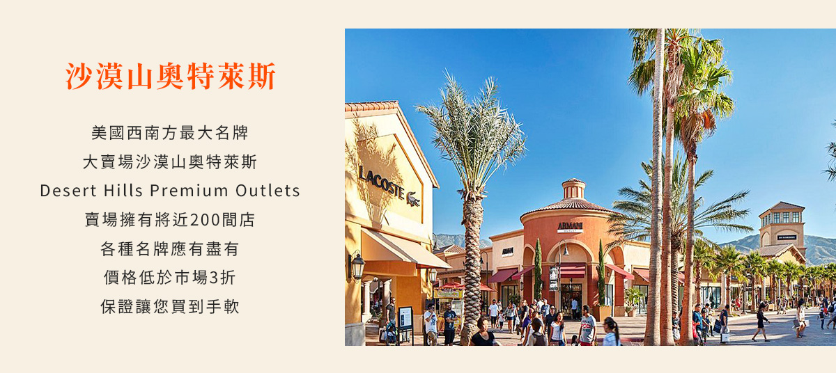 美國西南方最大的名牌大賣場沙漠山奧特萊斯【★Desert Hills Premium Outlets】,賣場擁有將近200間店,各種名牌應有盡有,價格低於市場3折,保證讓您買到手軟。