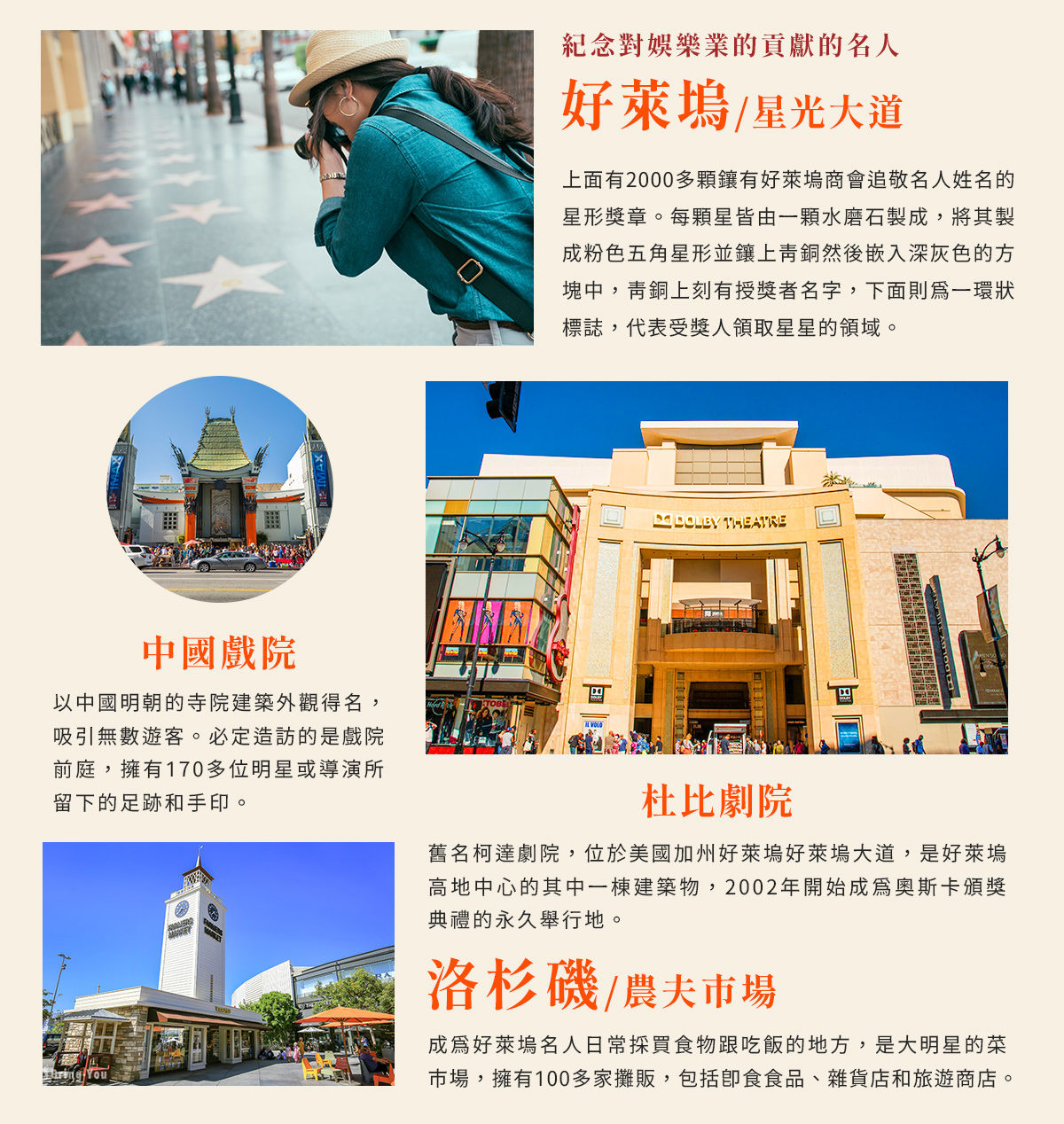 【●好萊塢星光大道】是條沿著美國好萊塢大道與藤街伸展的人行道,上面有2000多顆鑲有好萊塢商會追敬名人姓名的星形獎章,以紀念他們對娛樂業的貢獻。每顆星皆由一顆水磨石製成,將其製成粉色五角星形並鑲上青銅然後嵌入深灰色的方塊中,青銅上刻有授獎者名字,下面則為一環狀標誌,代表受獎人領取星星的領域。
