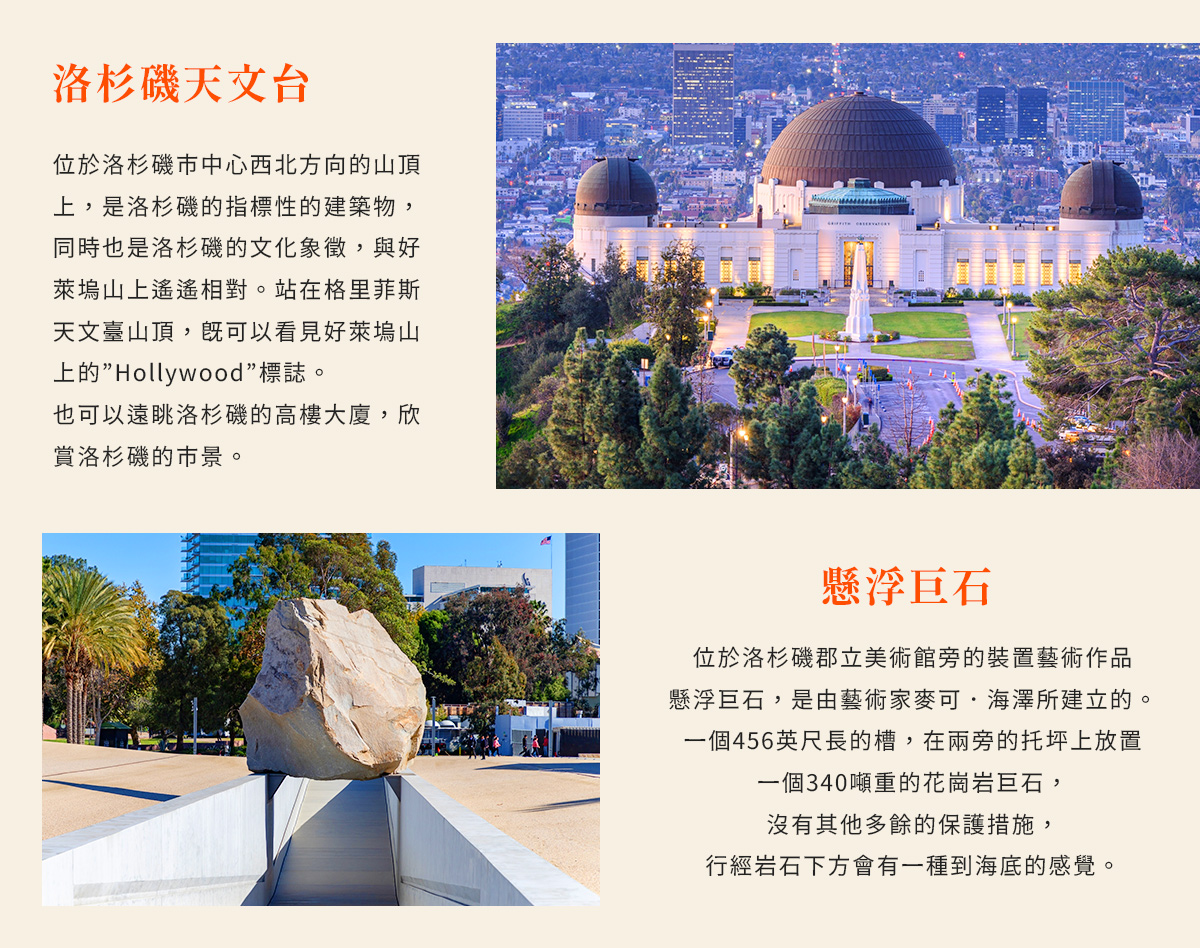 【洛杉磯天文台-●格里菲斯天文臺」位於洛杉磯市中心西北方向的山頂上,洛杉磯的文化象徵,與好萊塢山上遙遙相對。站在格里菲斯天文臺山頂,既可以看見好萊塢山上的”Hollywood”標誌也可以遠眺洛杉磯的高樓大廈,欣賞洛杉磯的市景。