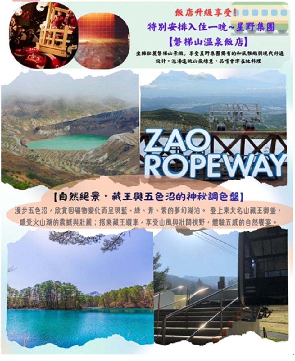 ※如遇藏王纜車與其他景點之預約時間重疊,或因時間安排難以順利完成整體行程時,將以「藏王纜車」為本行程之主要重點景點,其他重疊行程則有可能取消(退費),敬請見諒與理解。