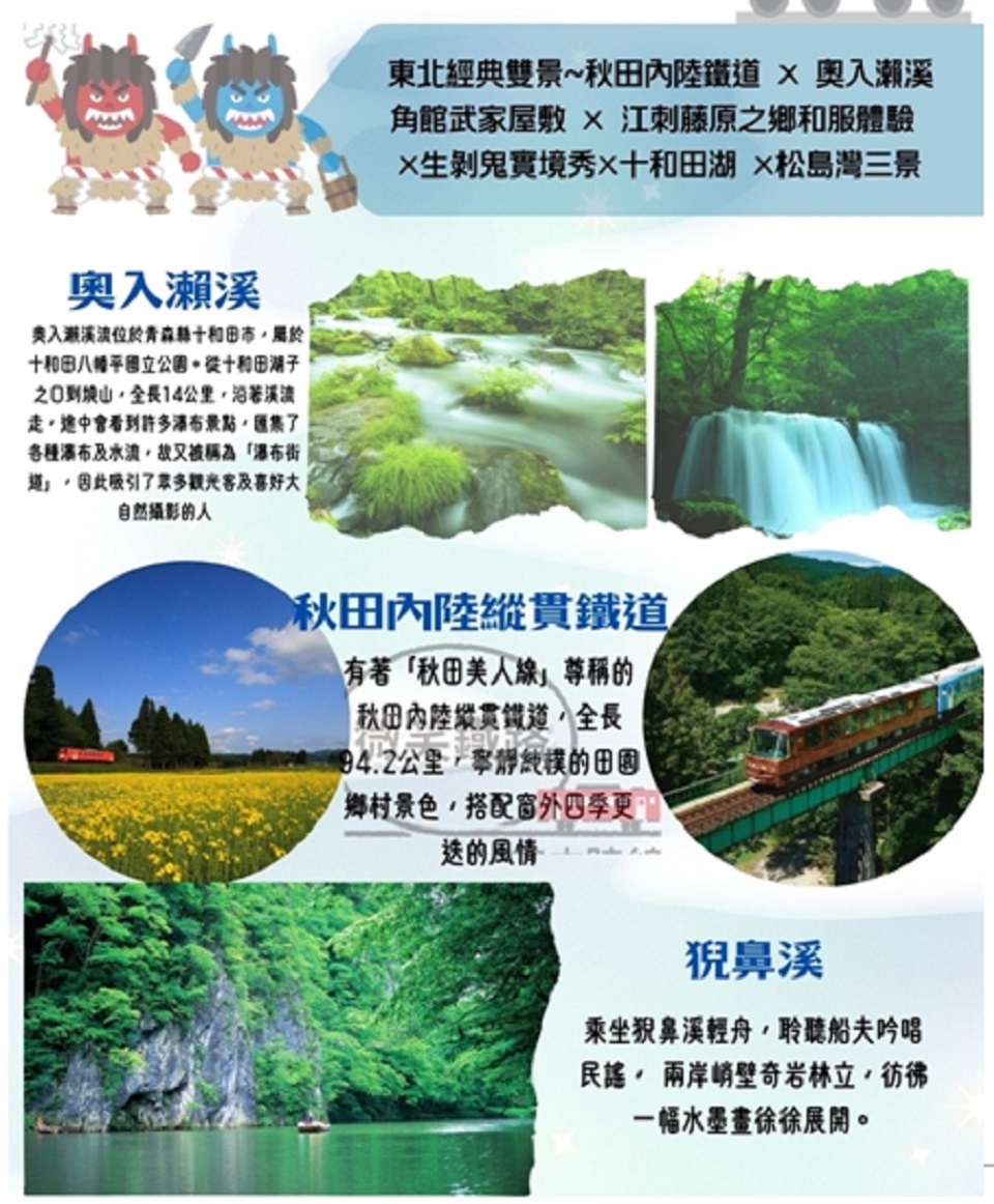 【秋田內陸鐵道】位於日本東北是縱貫秋田縣北部的本地鐵道路線,全長94.2公里,也被稱之為「微笑鐵道」,復古列車沿途經過的景色隨著四季變化,可欣賞溪谷、鐵橋等山色景緻,沿途的風景與人文體驗讓人樂而忘返,一年四季皆魅力無比。