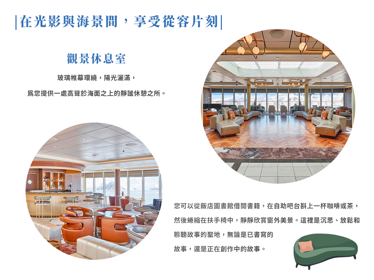 沿途可見巨型冰山漂浮海面,這些冰體源自南極冰架的自然崩解,壯闊而原始,彷彿靜止的時間雕塑。當郵輪緩緩穿行其間,您將近距離感受這片冰雪世界的純粹與震撼。