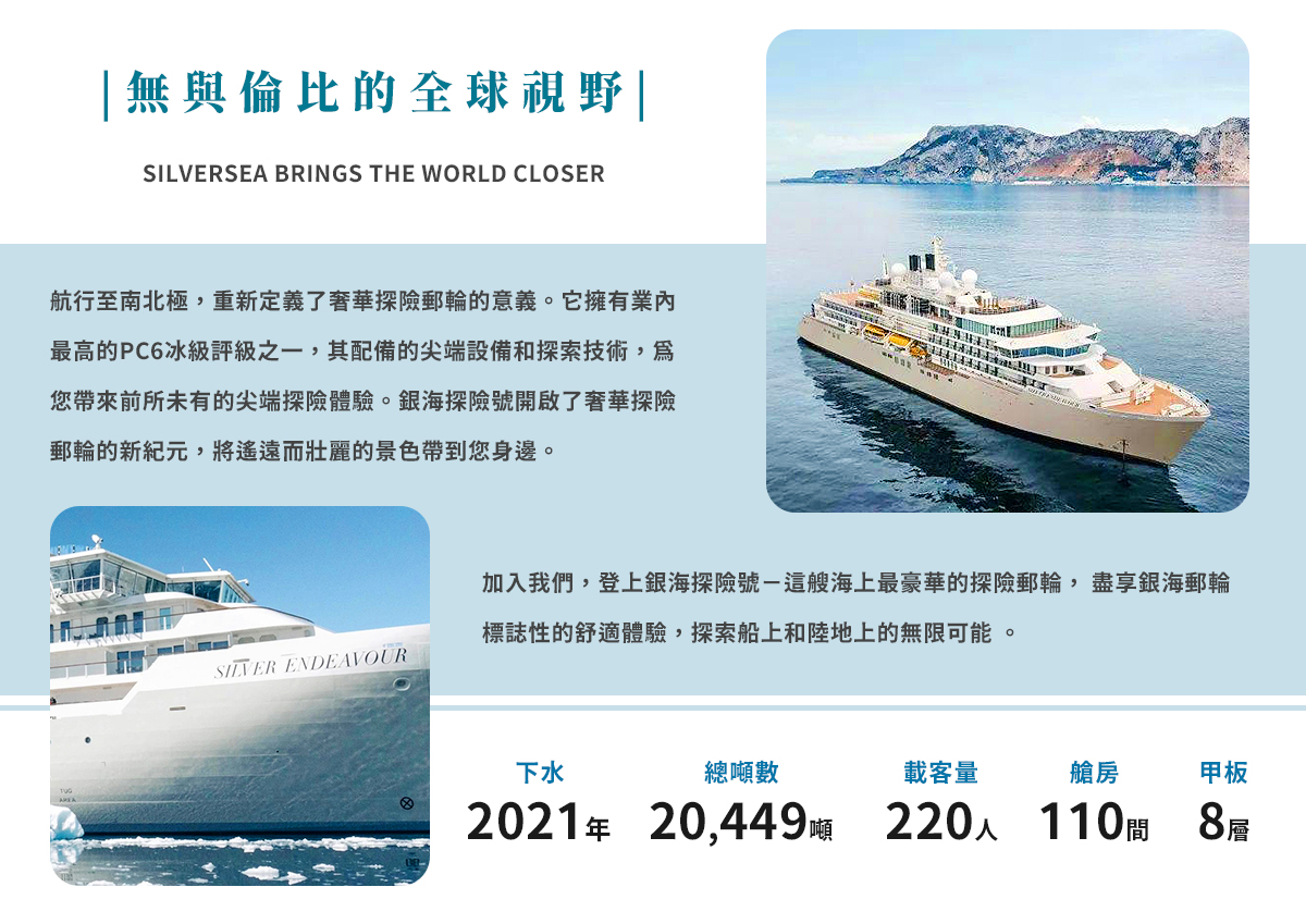 ※我們建議您攜帶裝滿水的銀海郵輪水瓶,以便在戶外活動中保持水分,並攜帶銀海郵輪背包來裝您的必需品。建議將電子設備密封在防水袋中,以防下雨或被水濺濕