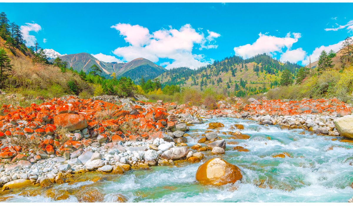 【洛絨牛場】被三座神山環繞,貢嘎河從草場穿梭,林間溪流潺潺,輿牧場木屋交相輝映,構成了一幅原始而又迷人的景色,令人們進入返璞歸真的境界。