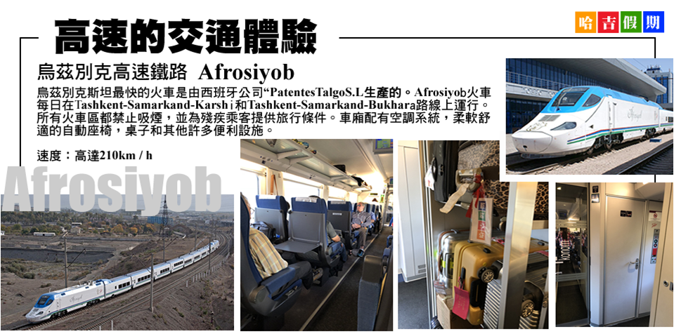 ★貼心安排搭乘高速鐵路(塔什干/布哈拉)及(撒馬爾罕/塔什干)二段高鐵,讓行程更輕鬆。