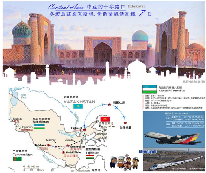 ★特別安排搭乘星空聯盟‧韓亞航空,桃園經首爾轉機飛往歐亞烏茲別克斯坦共和國首都‧塔什干。