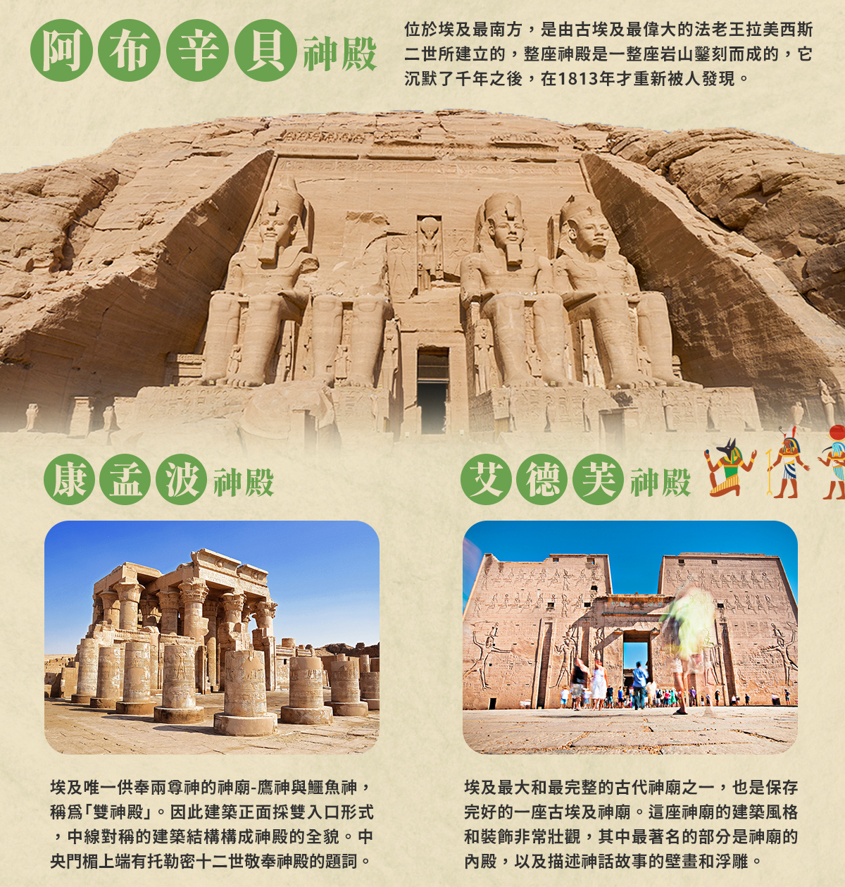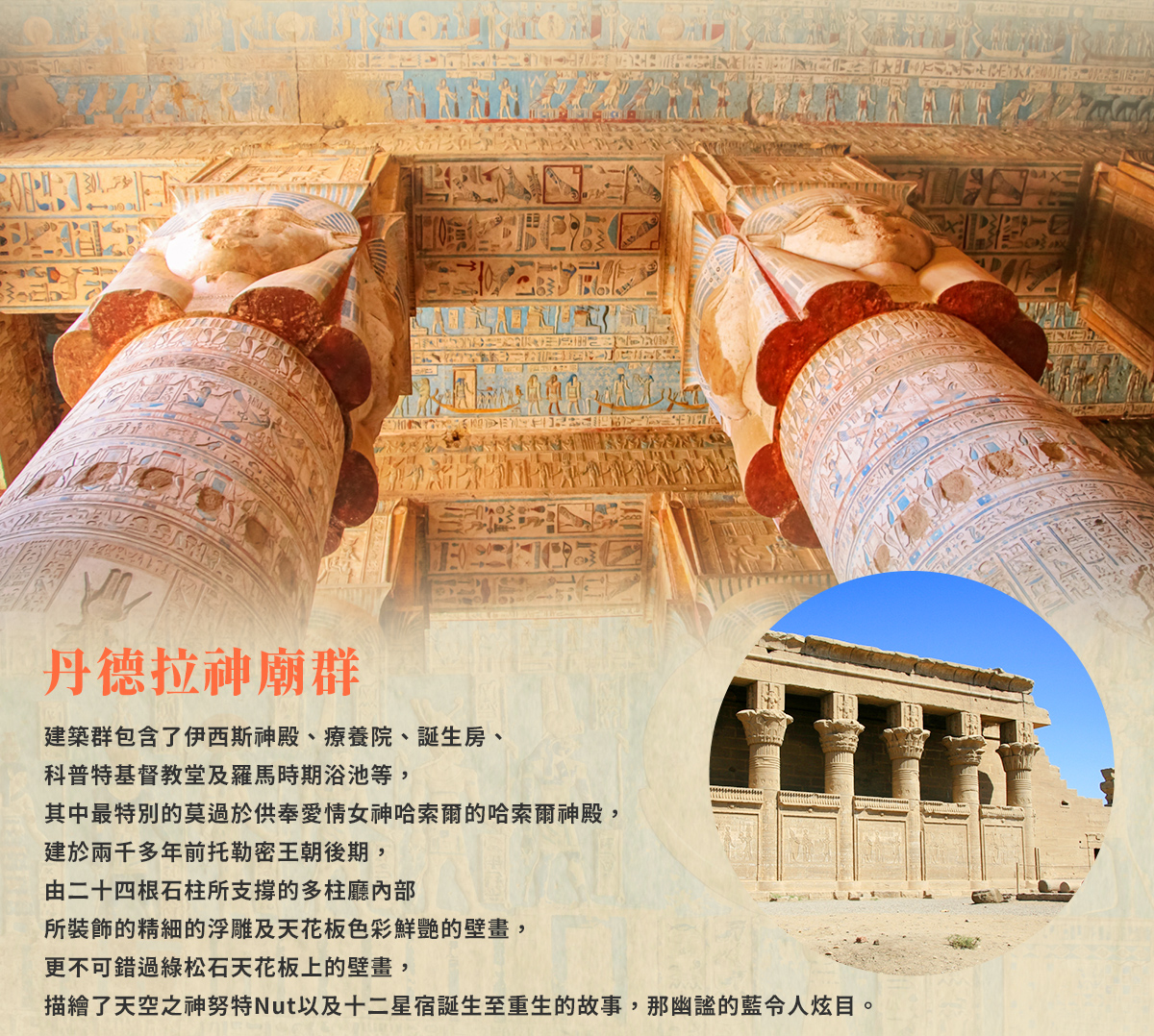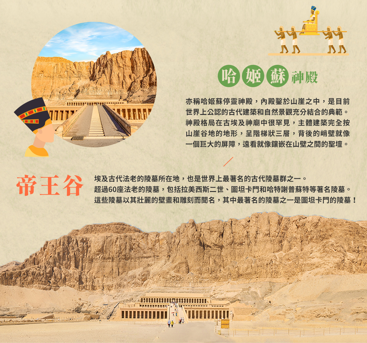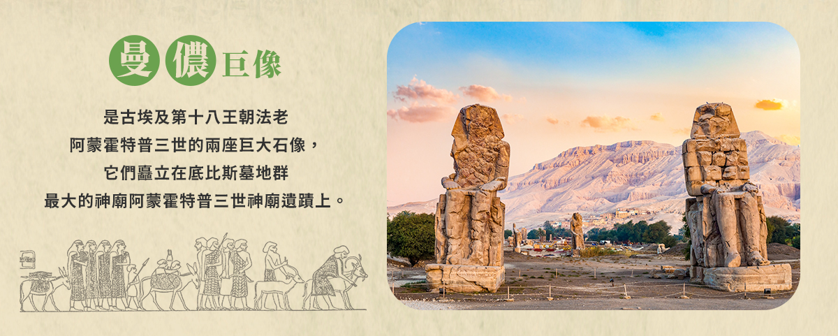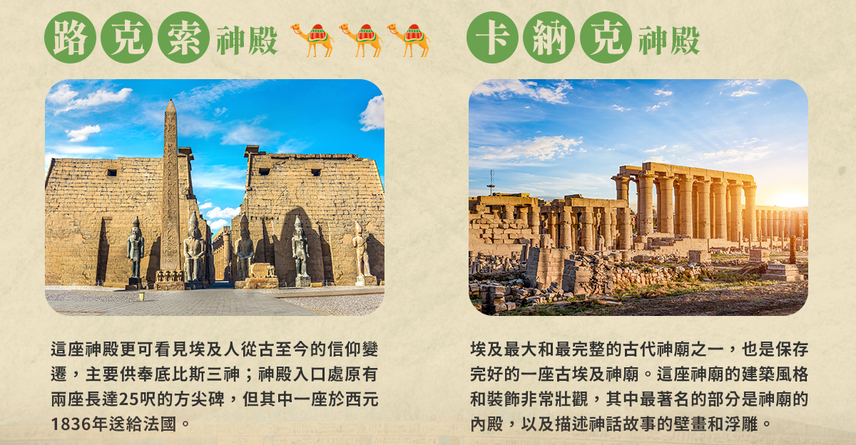 ※路克索–古埃及首都、卡納克神殿、路克索神殿、哈姬蘇女王神殿、曼儂巨像。